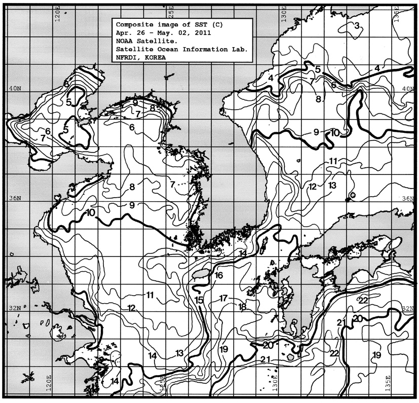 o 금주(2011.04.26~2011.05.02)의 한국근해 표면수온은 대화퇴 근해 6~7도, 울릉도 근해 10~11도, 대마도 근해 15~16도, 제주도 근해 13~15도, 이어도 근해 11~12도, 가거초 근해 12~13도, 어청도 근해 8~9도로 나타납니다. o「평년에 비해」대화퇴 근해 2.8도 낮게, 울릉도 근해 2도 낮게, 대마도 근해 비슷하게, 제주도 근해 1도 낮게, 이어도 근해 0.8도 낮게, 가거초 근해 1.8도 높게, 어청도 근해는 비슷하게 나타납니다. o「전년에 비해」대화퇴 근해 1.5도 낮게, 울릉도 근해 3도 낮게, 대마도 근해 비슷하게, 제주도 근해 1도 낮게, 이어도 근해 1도 높게, 가거초 근해 3도 높게, 어청도 근해는 비슷하게 나타납니다. o 수온 전선대는 우리나라 제주해협에서 대한해협까지 13도를 중심으로 형성됩니다.