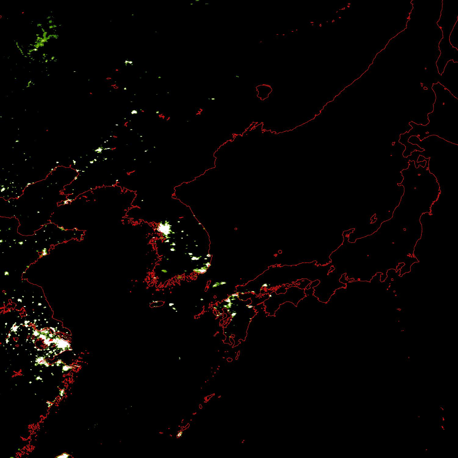 o 2011년 05월 01일 19시 15분 DMSP/OLS(Detense Meteorological Satellite Program/Operating Linescan System) 영상입니다. o DMSP/OLS는 야간 불빛을 탐지하는 위성으로, 야간 조업 어선 분포 현황을 알 수 있습니다. o 그림을 클릭하시면 크게 보실 수 있습니다.