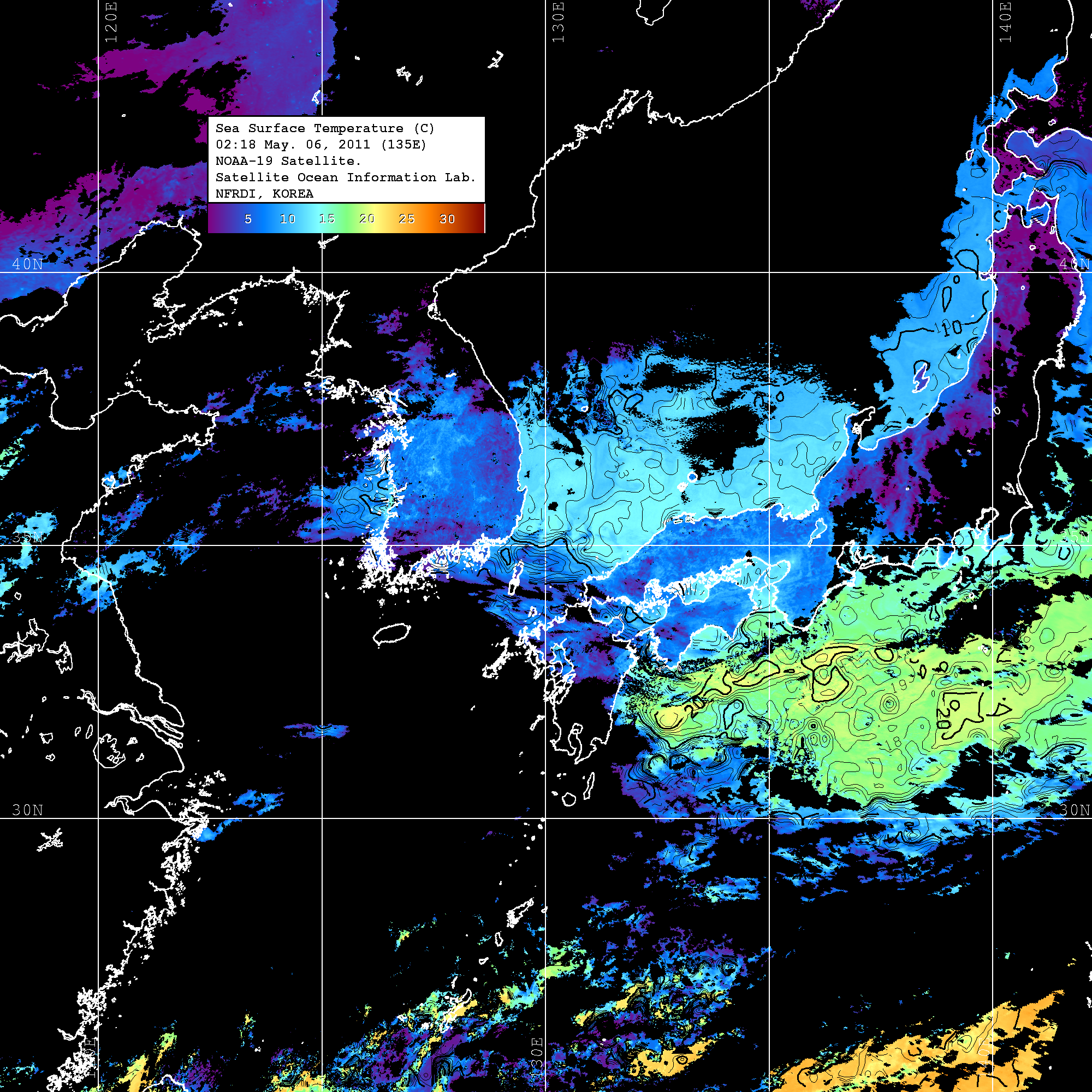 o 2011년 05월 06일 02시 18분 NOAA-19호 위성영상입니다. o 수온분포는 범례를 참고하시기 바랍니다. o 검은색은 구름을 나타냅니다. o 그림을 클릭하시면 크게 보실 수 있습니다.