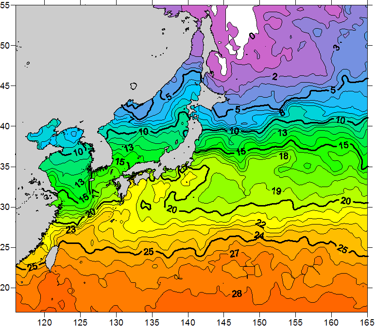 o 2011년 05월 06일 북서태평양 광역해양 수온분포 입니다. o 아래 위성 수온분포도는 국립수산과학원(NFRDI, Korea)과 일본동북대학교 (Tohoku University, Japan)가 공동연구개발 진행중, 1차 연구결과인 것으로 구름의 영향을 배제한 신기술의 수온정보입니다.