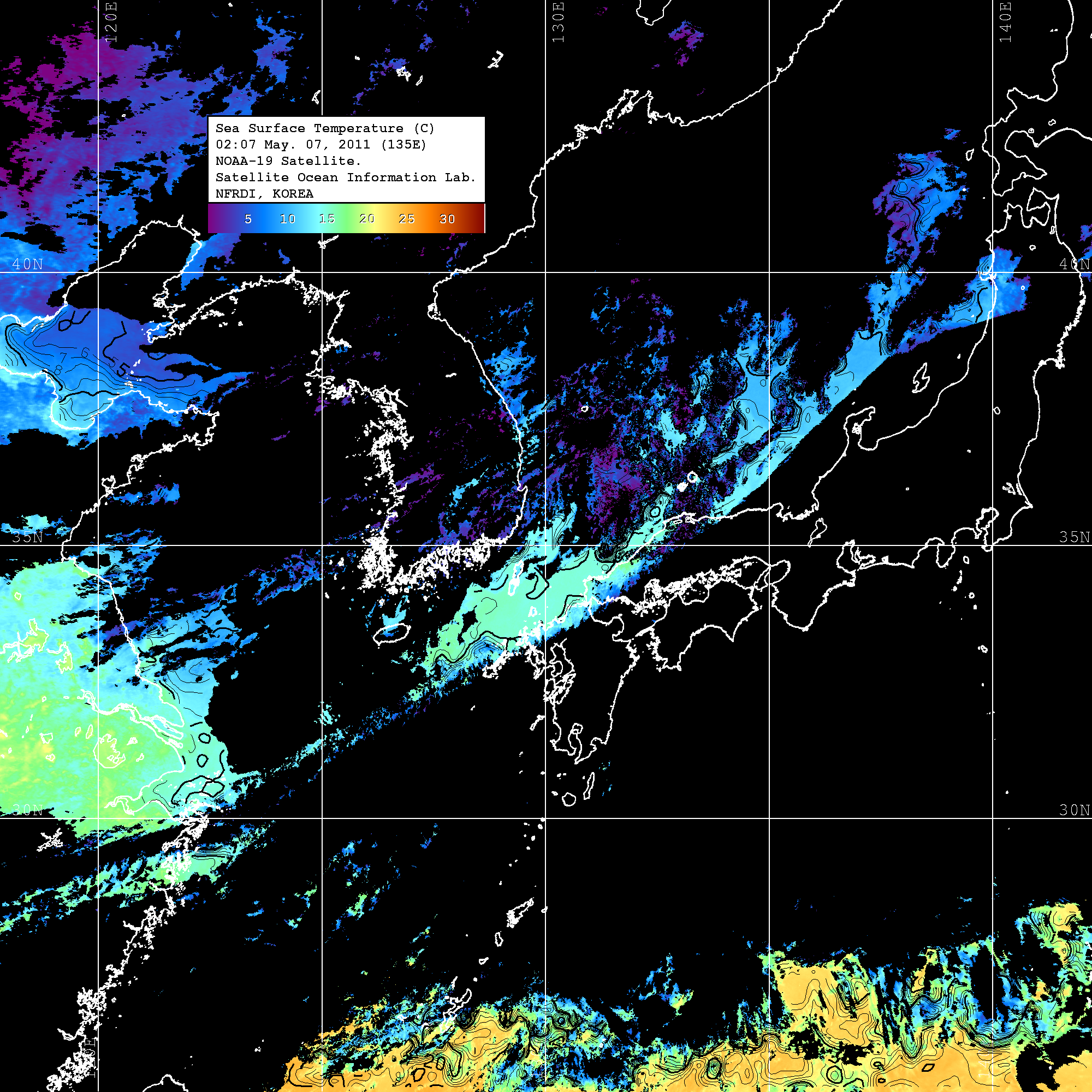 o 2011년 05월 07일 02시 07분 NOAA-19호 위성영상입니다. o 수온분포는 범례를 참고하시기 바랍니다. o 검은색은 구름을 나타냅니다. o 그림을 클릭하시면 크게 보실 수 있습니다.