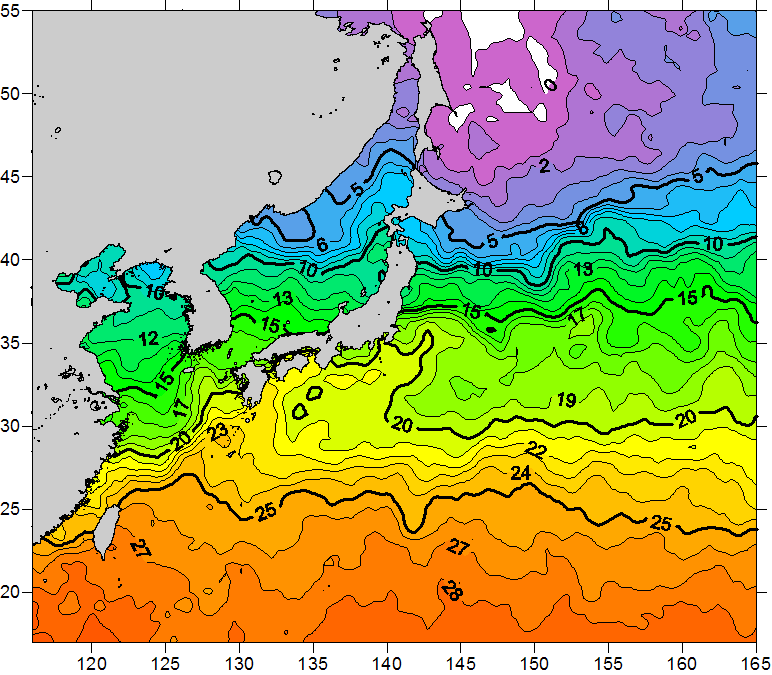 o 2011년 05월 08일 북서태평양 광역해양 수온분포 입니다. o 아래 위성 수온분포도는 국립수산과학원(NFRDI, Korea)과 일본동북대학교 (Tohoku University, Japan)가 공동연구개발 진행중, 1차 연구결과인 것으로 구름의 영향을 배제한 신기술의 수온정보입니다.