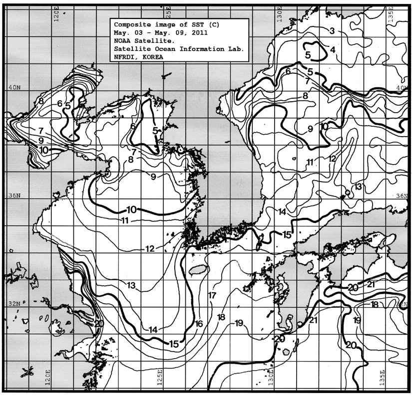 o 금주(2011.05.03~2011.05.09)의 한국근해 표면수온은 대화퇴 근해 6~8도, 울릉도 근해 10~11도, 대마도 근해 15~16도, 제주도 근해 15~16도, 이어도 근해 13~14도, 가거초 근해 12~13도, 어청도 근해 8~10도로 나타납니다. o「평년에 비해」대화퇴 근해 3.9도 낮게, 울릉도 근해 3.1도 낮게, 대마도 근해 0.9도 낮게, 제주도 근해 비슷하게, 이어도 근해 0.3도 낮게, 가거초 근해 0.3도 높게, 어청도 근해는 1.2도 낮게 나타납니다. o「전년에 비해」대화퇴 근해 3도 낮게, 울릉도 근해 2도 낮게, 대마도 근해 0.5도 높게, 제주도 근해 1도 높게, 이어도 근해 0.5도 높게, 가거초 근해 2도 높게, 어청도 근해는 비슷하게 나타납니다. o 수온 전선대는 우리나라 제주해협에서 대한해협까지 14도를 중심으로 형성됩니다.
