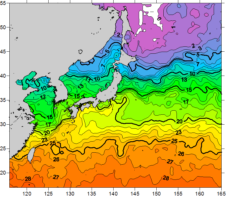 o 2011년 05월 10일 북서태평양 광역해양 수온분포 입니다. o 아래 위성 수온분포도는 국립수산과학원(NFRDI, Korea)과 일본동북대학교 (Tohoku University, Japan)가 공동연구개발 진행중, 1차 연구결과인 것으로 구름의 영향을 배제한 신기술의 수온정보입니다.
