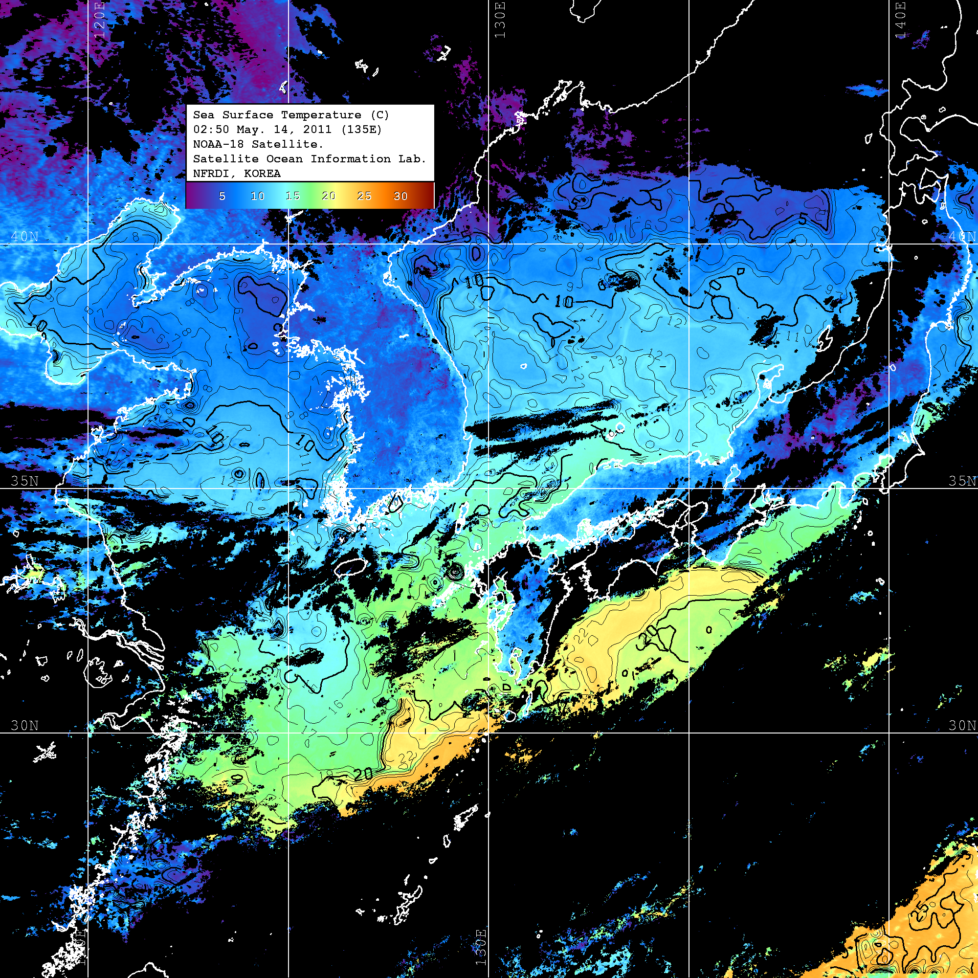o 2011년 05월 14일 02시 50분 NOAA-18호 위성영상입니다. o 수온분포는 범례를 참고하시기 바랍니다. o 검은색은 구름을 나타냅니다. o 그림을 클릭하시면 크게 보실 수 있습니다.