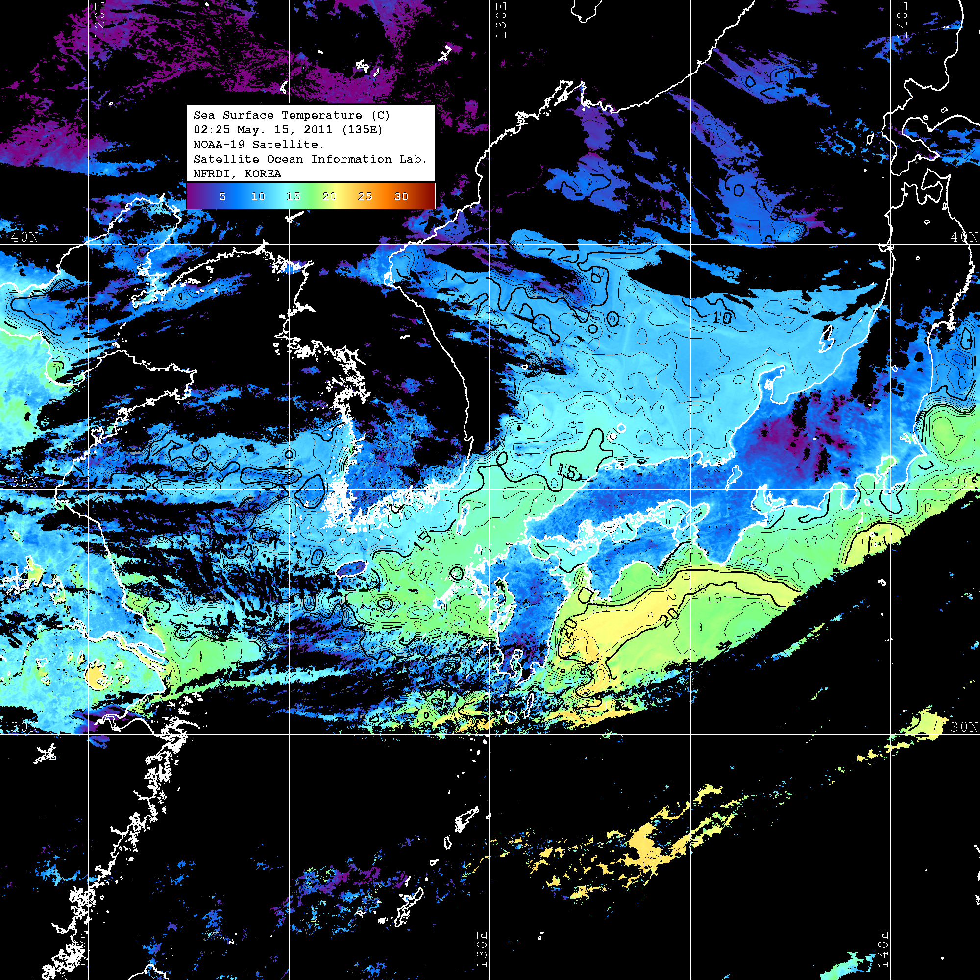 o 2011년 05월 15일 02시 25분 NOAA-19호 위성영상입니다. o 수온분포는 범례를 참고하시기 바랍니다. o 검은색은 구름을 나타냅니다. o 그림을 클릭하시면 크게 보실 수 있습니다.