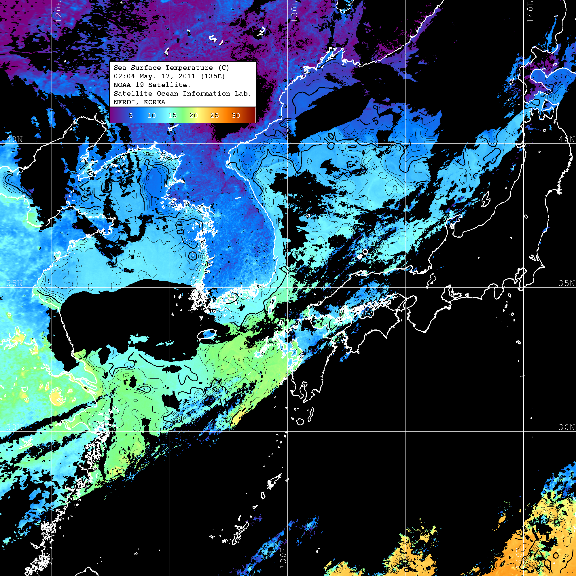 o 2011년 05월 17일 02시 04분 NOAA-19호 위성영상입니다. o 수온분포는 범례를 참고하시기 바랍니다. o 검은색은 구름을 나타냅니다. o 그림을 클릭하시면 크게 보실 수 있습니다.
