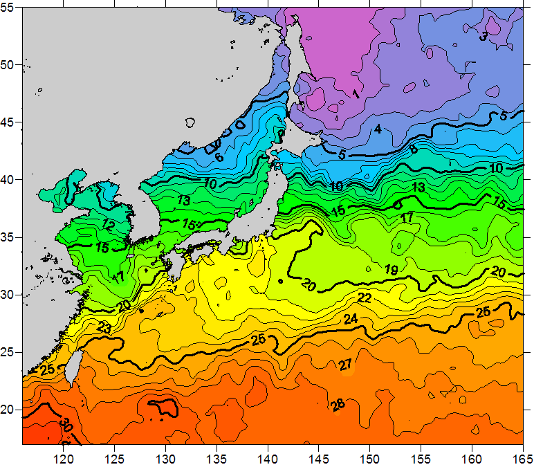 o 2011년 05월 16일 북서태평양 광역해양 수온분포 입니다. o 아래 위성 수온분포도는 국립수산과학원(NFRDI, Korea)과 일본동북대학교 (Tohoku University, Japan)가 공동연구개발 진행중, 1차 연구결과인 것으로 구름의 영향을 배제한 신기술의 수온정보입니다.