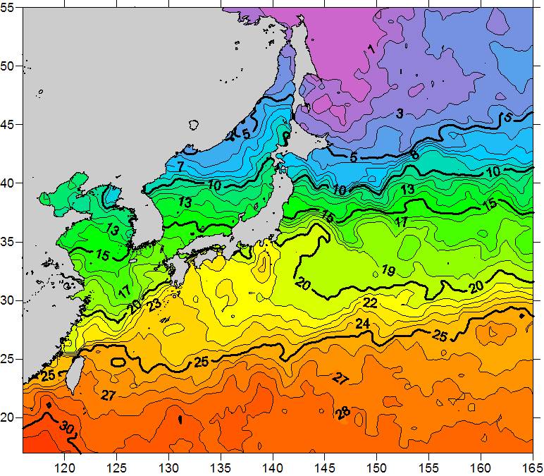 o 2011년 05월 17일 북서태평양 광역해양 수온분포 입니다. o 아래 위성 수온분포도는 국립수산과학원(NFRDI, Korea)과 일본동북대학교 (Tohoku University, Japan)가 공동연구개발 진행중, 1차 연구결과인 것으로 구름의 영향을 배제한 신기술의 수온정보입니다.