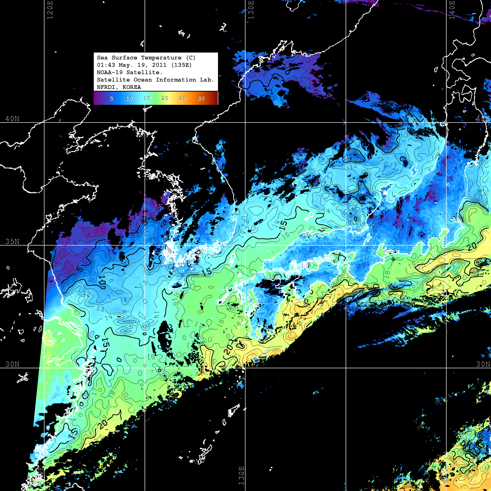 o 2011년 05월 19일 01시 43분 NOAA-19호 위성영상입니다. o 수온분포는 범례를 참고하시기 바랍니다. o 검은색은 구름을 나타냅니다. o 그림을 클릭하시면 크게 보실 수 있습니다.