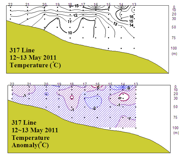 ㅇ 수심 20∼50m 사이에 수온약층이 약하게 형성되었고, 저층에서 10℃이하의 저온수괴가 보였습니다. ㅇ 평년에 비하여 일부 해역을 제외한 대부분의 해역에서 1~2℃내외의 저온상을 나타내었습니다.