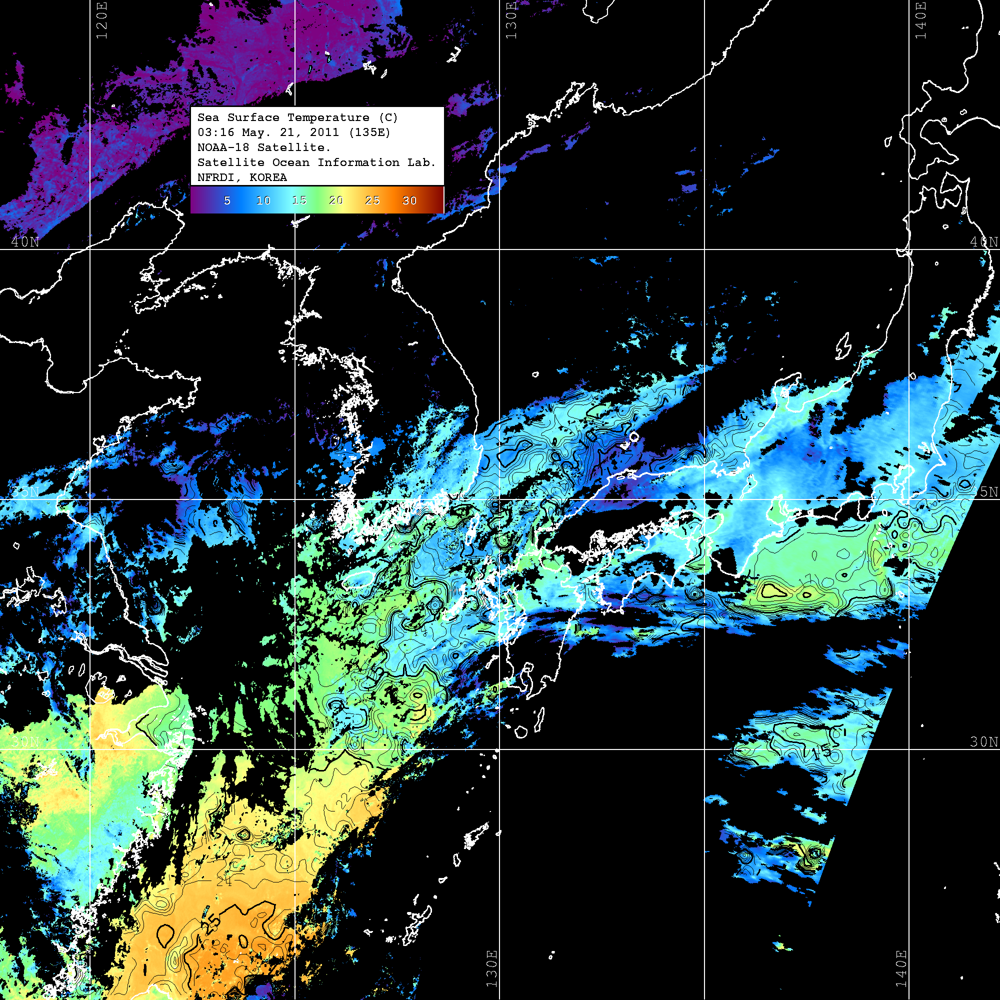 o 2011년 05월 21일 03시 16분 NOAA-18호 위성영상입니다. o 수온분포는 범례를 참고하시기 바랍니다. o 검은색은 구름을 나타냅니다. o 그림을 클릭하시면 크게 보실 수 있습니다.