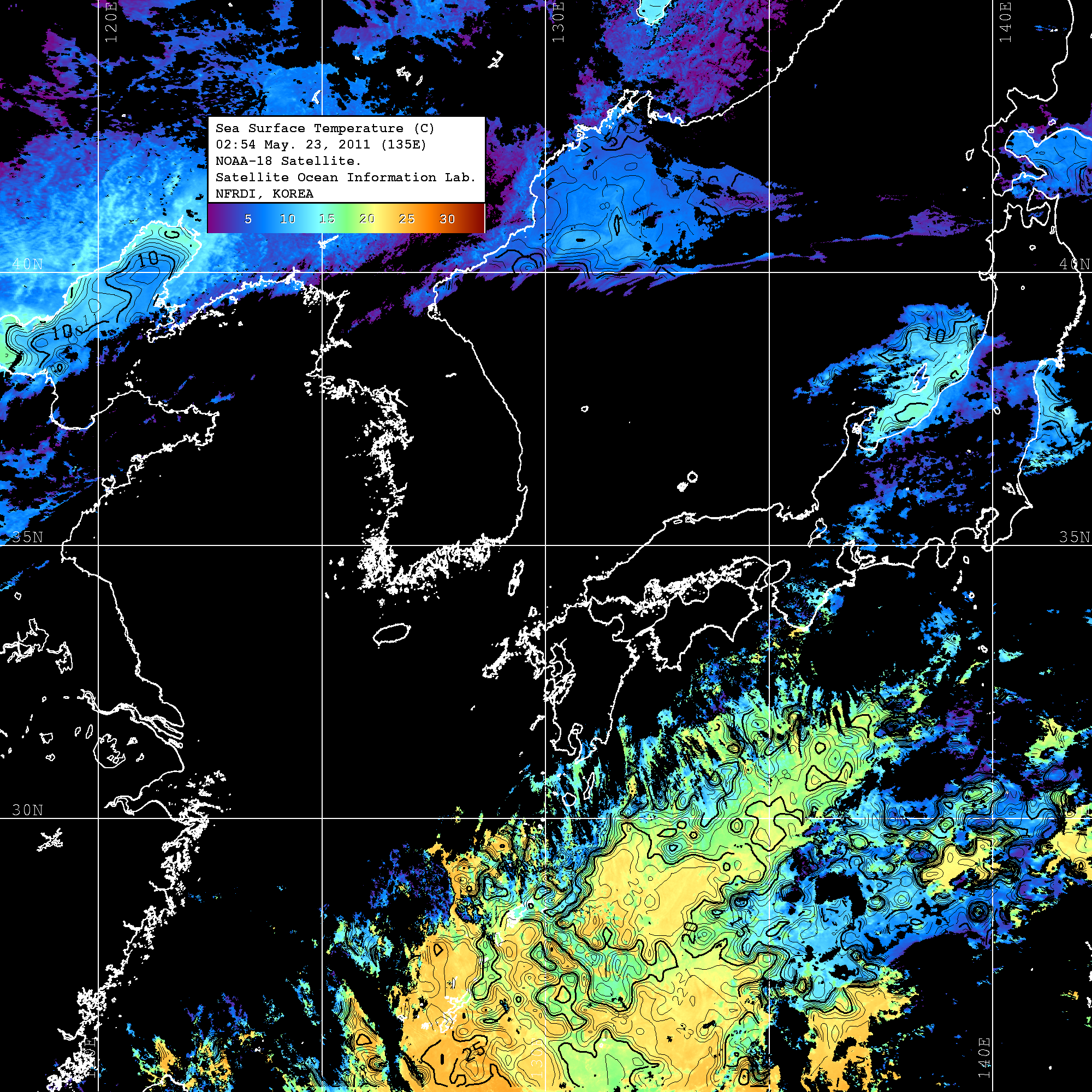 o 2011년 05월 23일 02시 54분 NOAA-18호 위성영상입니다. o 수온분포는 범례를 참고하시기 바랍니다. o 검은색은 구름을 나타냅니다. o 그림을 클릭하시면 크게 보실 수 있습니다.