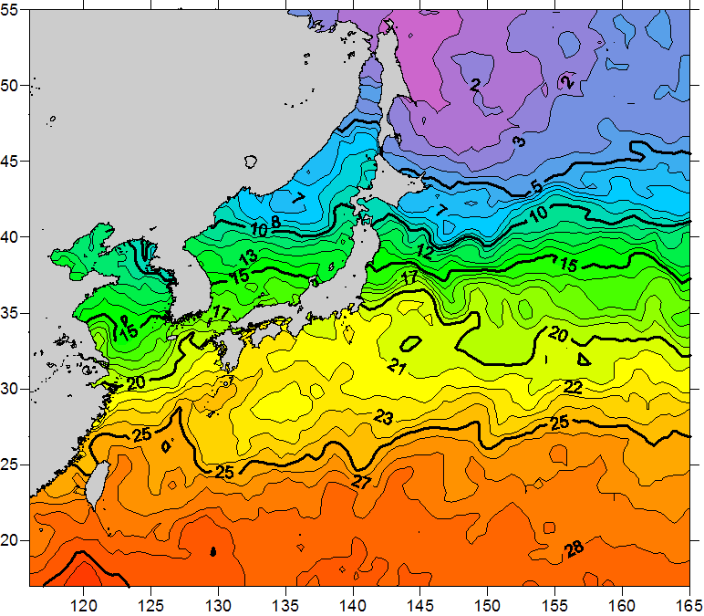 o 2011년 05월 21일 북서태평양 광역해양 수온분포 입니다. o 아래 위성 수온분포도는 국립수산과학원(NFRDI, Korea)과 일본동북대학교 (Tohoku University, Japan)가 공동연구개발 진행중, 1차 연구결과인 것으로 구름의 영향을 배제한 신기술의 수온정보입니다.