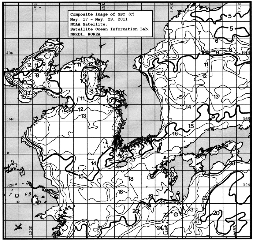 o 금주(2011.05.17~2011.05.23)의 한국근해 표면수온은 대화퇴 근해 9~11도, 울릉도 근해 11~12도, 대마도 근해 16~17도, 제주도 근해 15~16도, 이어도 근해 16~17도, 가거초 근해 14~15도, 어청도 근해 13~14도로 나타납니다. o「평년에 비해」대화퇴 근해 1.9도 낮게, 울릉도 근해 3.1도 낮게, 대마도 근해 0.7도 낮게, 제주도 근해 1도 낮게, 이어도 근해 0.4도 높게, 가거초 근해 0.7도 높게, 어청도 근해는 0.9도 높게 나타납니다. o「전년에 비해」대화퇴 근해 2.5도 낮게, 울릉도 근해 2도 낮게, 대마도 근해 0.5도 높게, 제주도 근해 0.5도 낮게, 이어도 근해 1도 높게, 가거초 근해 4도 높게, 어청도 근해는 2도 높게 나타납니다. o 수온 전선대는 우리나라 제주해협에서 대한해협까지 14도를 중심으로 형성됩니다.