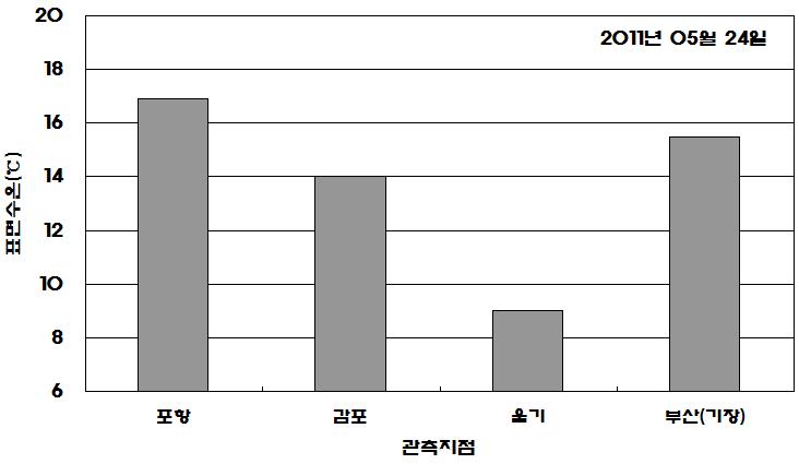o 2011년 05월 24일 오후 5시를 기해 울기 연안 냉수대 주의보를 발령합니다. o 아래 그림은 2011년 05월 24일 오전 10시에 관측된 현장 표면수온 분포입니다. o 오전 10시 현재 연안 관측 표면수온은 포항 16.9도, 감포 14.0도, 울기 9.0도, 부산(기장)은 15.5도로 나타납니다. o 냉수대가 발생한 해역은 수온변동과 짙은 안개가 나타나고 있어 각별한 주의가 필요합니다. |