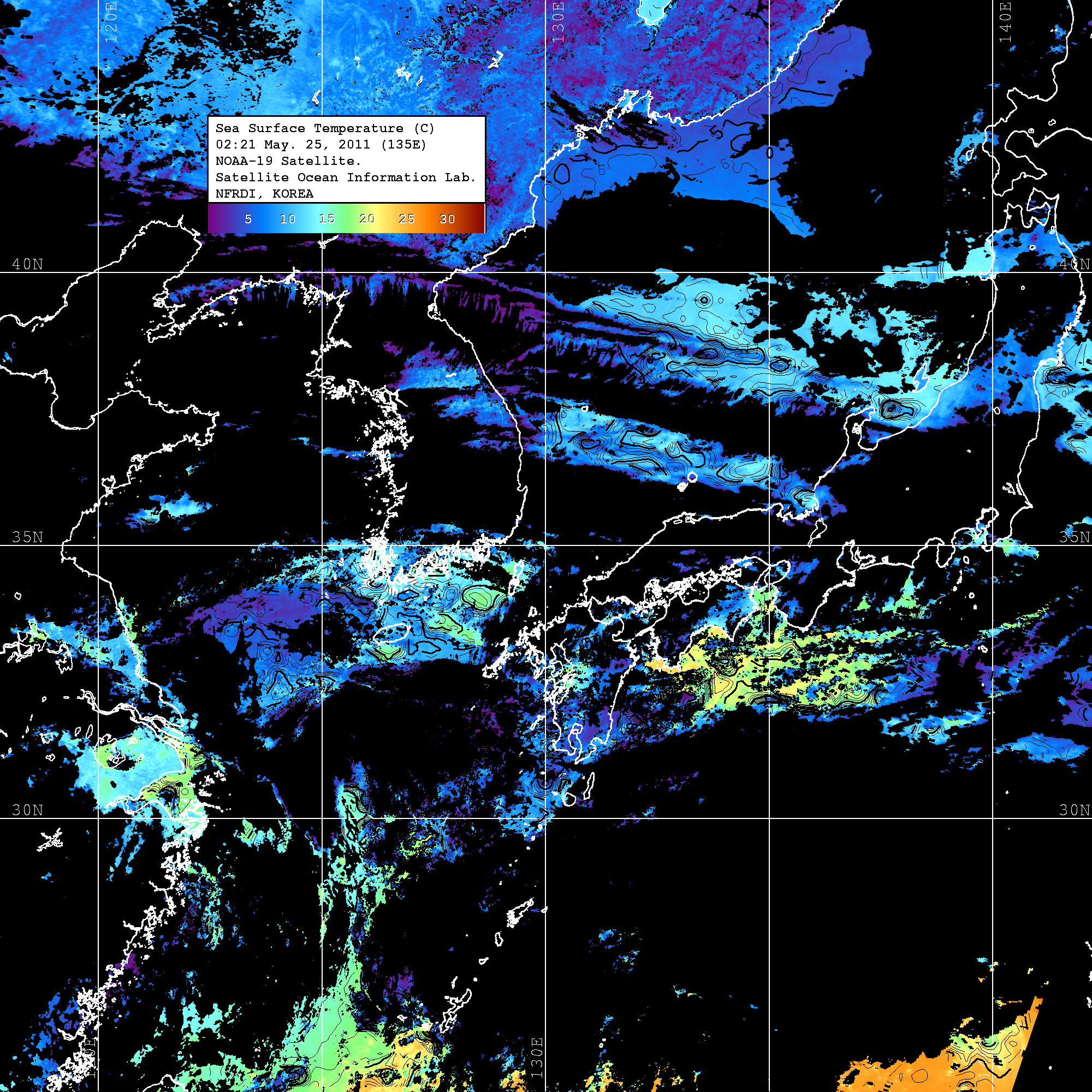 o 2011년 05월 25일 02시 21분 NOAA-19호 위성영상입니다. o 수온분포는 범례를 참고하시기 바랍니다. o 검은색은 구름을 나타냅니다. o 그림을 클릭하시면 크게 보실 수 있습니다.