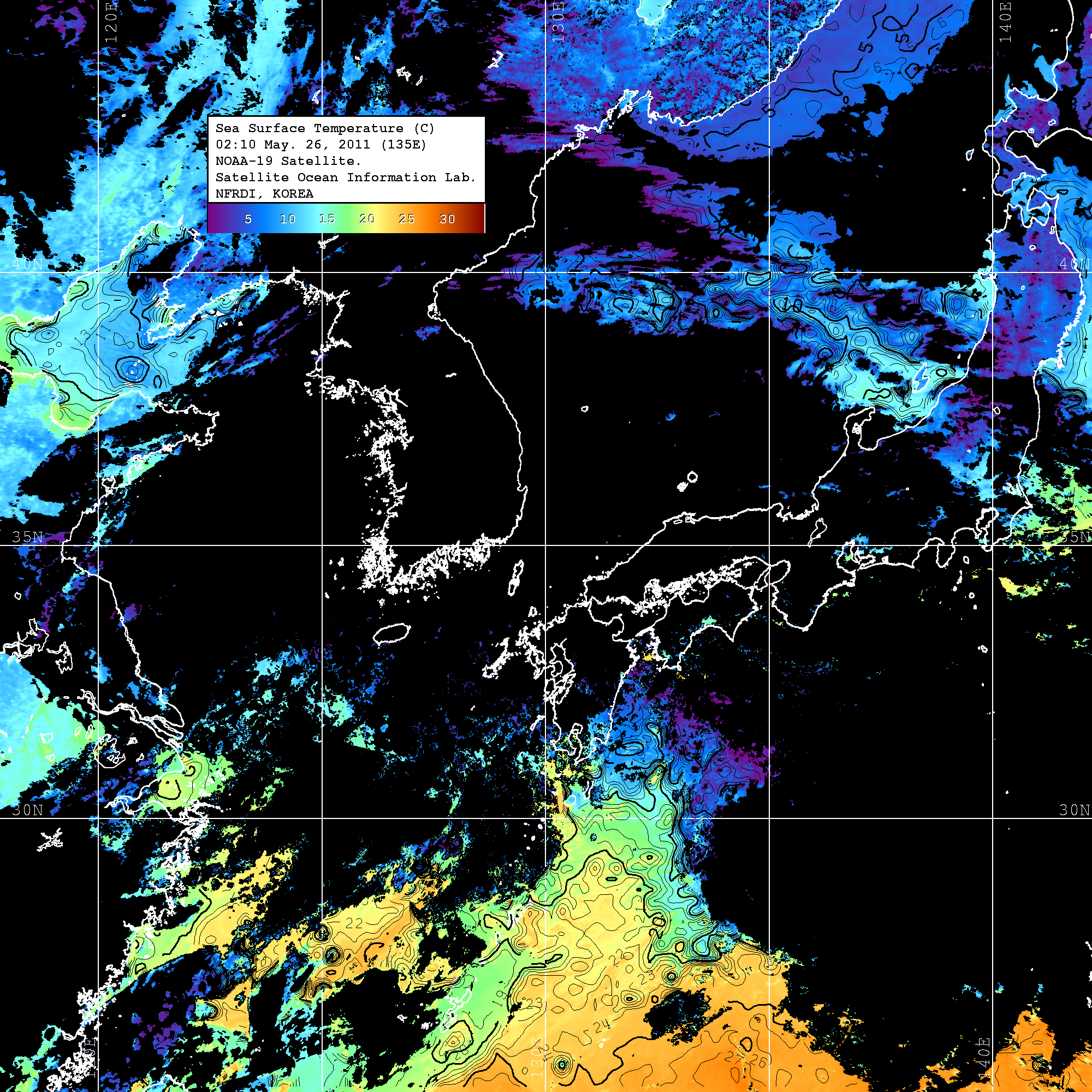 o 2011년 05월 26일 02시 10분 NOAA-19호 위성영상입니다. o 수온분포는 범례를 참고하시기 바랍니다. o 검은색은 구름을 나타냅니다. o 그림을 클릭하시면 크게 보실 수 있습니다.