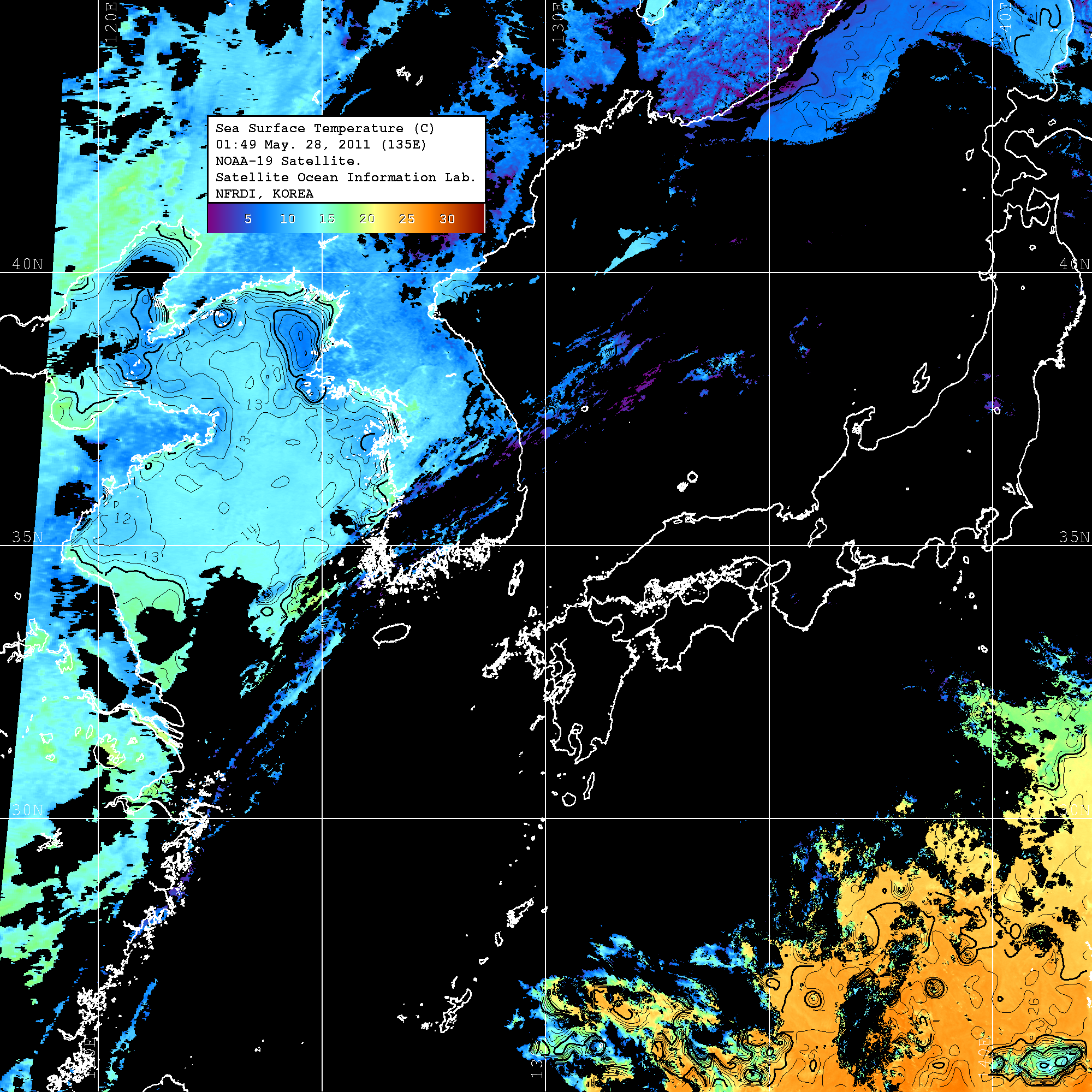 o 2011년 05월 28일 01시 49분 NOAA-19호 위성영상입니다. o 수온분포는 범례를 참고하시기 바랍니다. o 검은색은 구름을 나타냅니다. o 그림을 클릭하시면 크게 보실 수 있습니다.