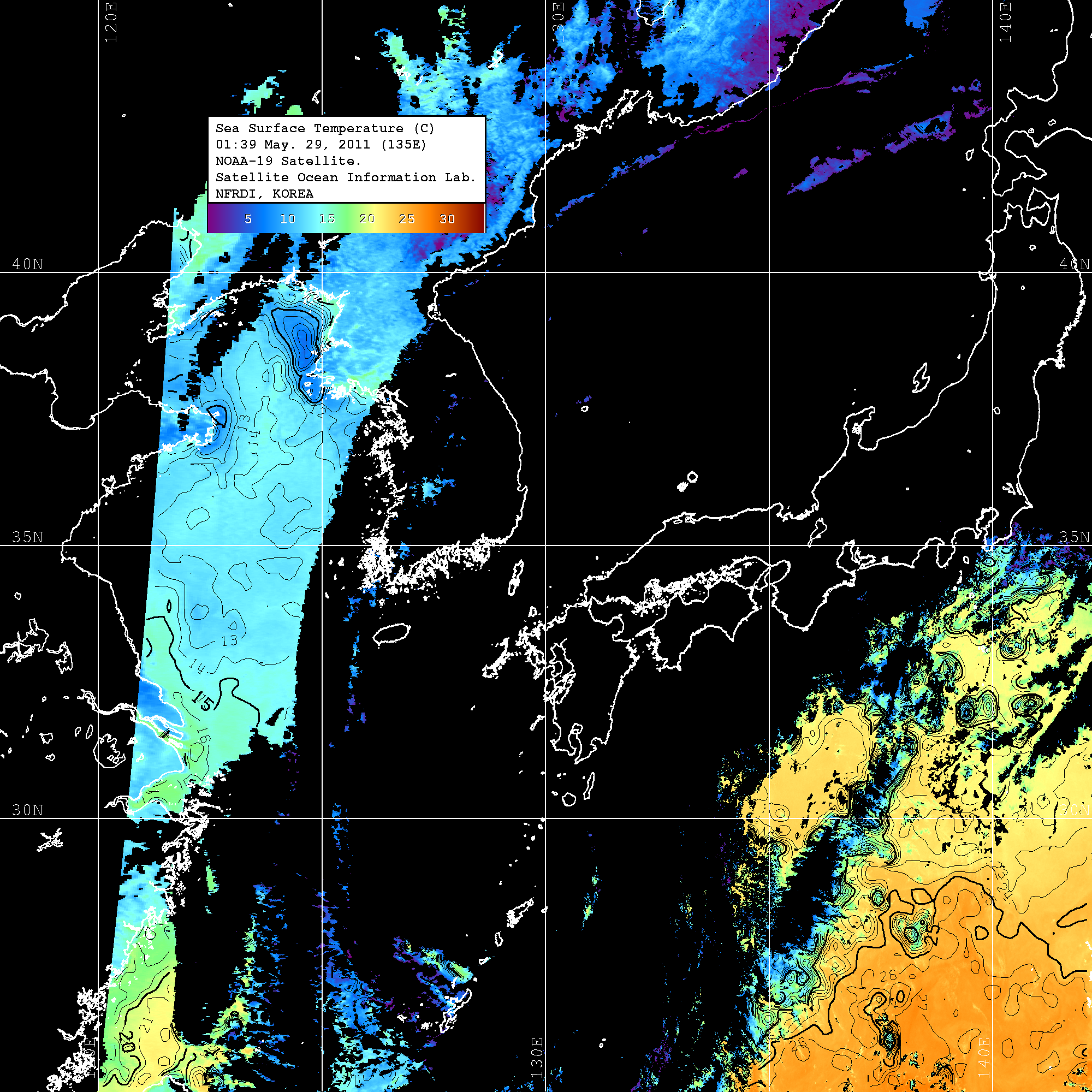o 2011년 05월 29일 01시 39분 NOAA-19호 위성영상입니다. o 수온분포는 범례를 참고하시기 바랍니다. o 검은색은 구름을 나타냅니다. o 그림을 클릭하시면 크게 보실 수 있습니다.