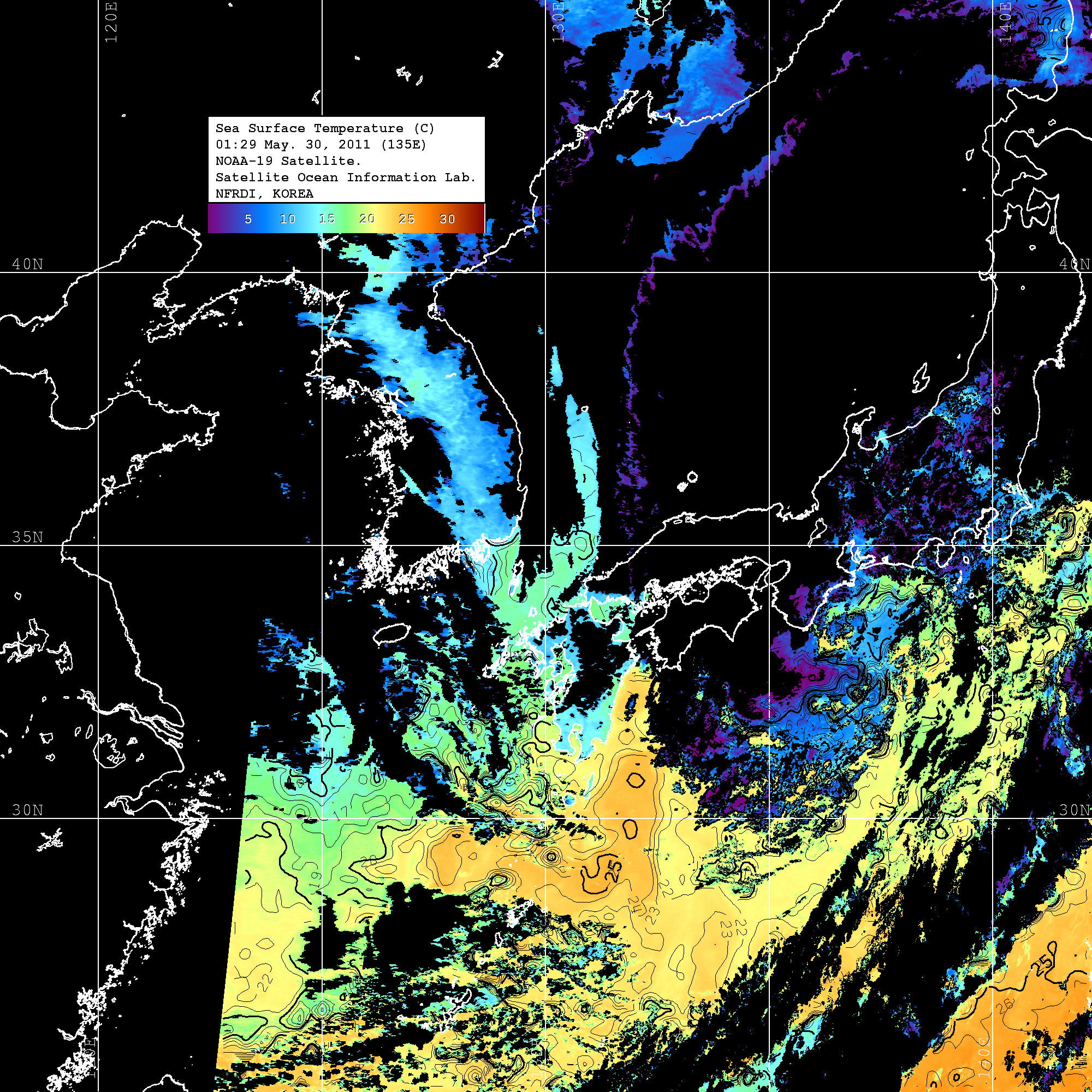 o 2011년 05월 30일 01시 29분 NOAA-19호 위성영상입니다. o 수온분포는 범례를 참고하시기 바랍니다. o 검은색은 구름을 나타냅니다. o 그림을 클릭하시면 크게 보실 수 있습니다.