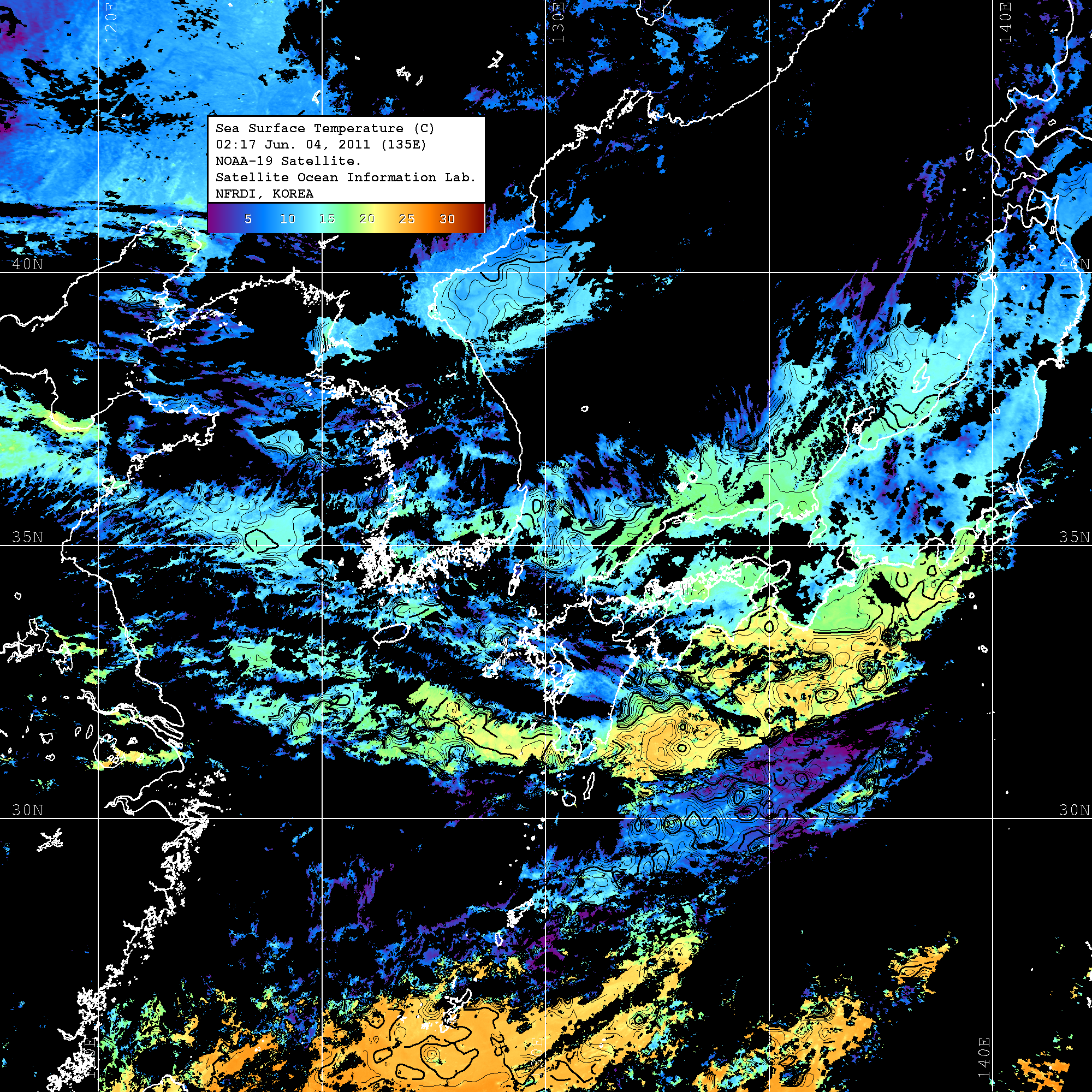 o 2011년 06월 04일 02시 17분 NOAA-19호 위성영상입니다. o 수온분포는 범례를 참고하시기 바랍니다. o 검은색은 구름을 나타냅니다. o 그림을 클릭하시면 크게 보실 수 있습니다.