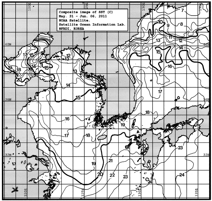 o 금주(2011.05.31~2011.06.06)의 한국근해 표면수온은 대화퇴 근해 13~14도, 울릉도 근해 16~17도, 대마도 근해 18~19도, 제주도 근해 18~20도, 이어도 근해 18~19도, 가거초 근해 17~18도, 어청도 근해 15~16도로 나타납니다. o「평년에 비해」대화퇴 근해 2.1도 낮게, 울릉도 근해 1.2도 낮게, 대마도 근해 0.8도 낮게, 제주도 근해 비슷하게, 이어도 근해 0.6도 낮게, 가거초 근해 0.5도 높게, 어청도 근해는 0.7도 낮게 나타납니다. o「전년에 비해」대화퇴 근해 3도 낮게, 울릉도 근해 2도 낮게, 대마도 근해 1도 낮게, 제주도 근해 0.5도 높게, 이어도 근해 1도 낮게, 가거초 근해 2도 높게, 어청도 근해는 비슷하게 나타납니다. o 수온 전선대는 우리나라 제주해협에서 대한해협까지 18도를 중심으로 형성됩니다.