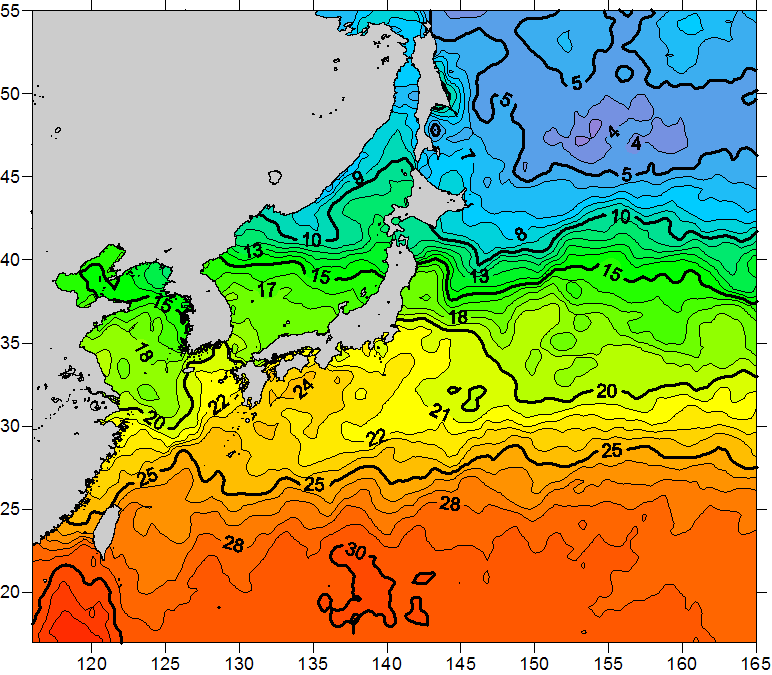 o 2011년 06월 06일 북서태평양 광역해양 수온분포 입니다. o 아래 위성 수온분포도는 국립수산과학원(NFRDI, Korea)과 일본동북대학교 (Tohoku University, Japan)가 공동연구개발 진행중, 1차 연구결과인 것으로 구름의 영향을 배제한 신기술의 수온정보입니다.