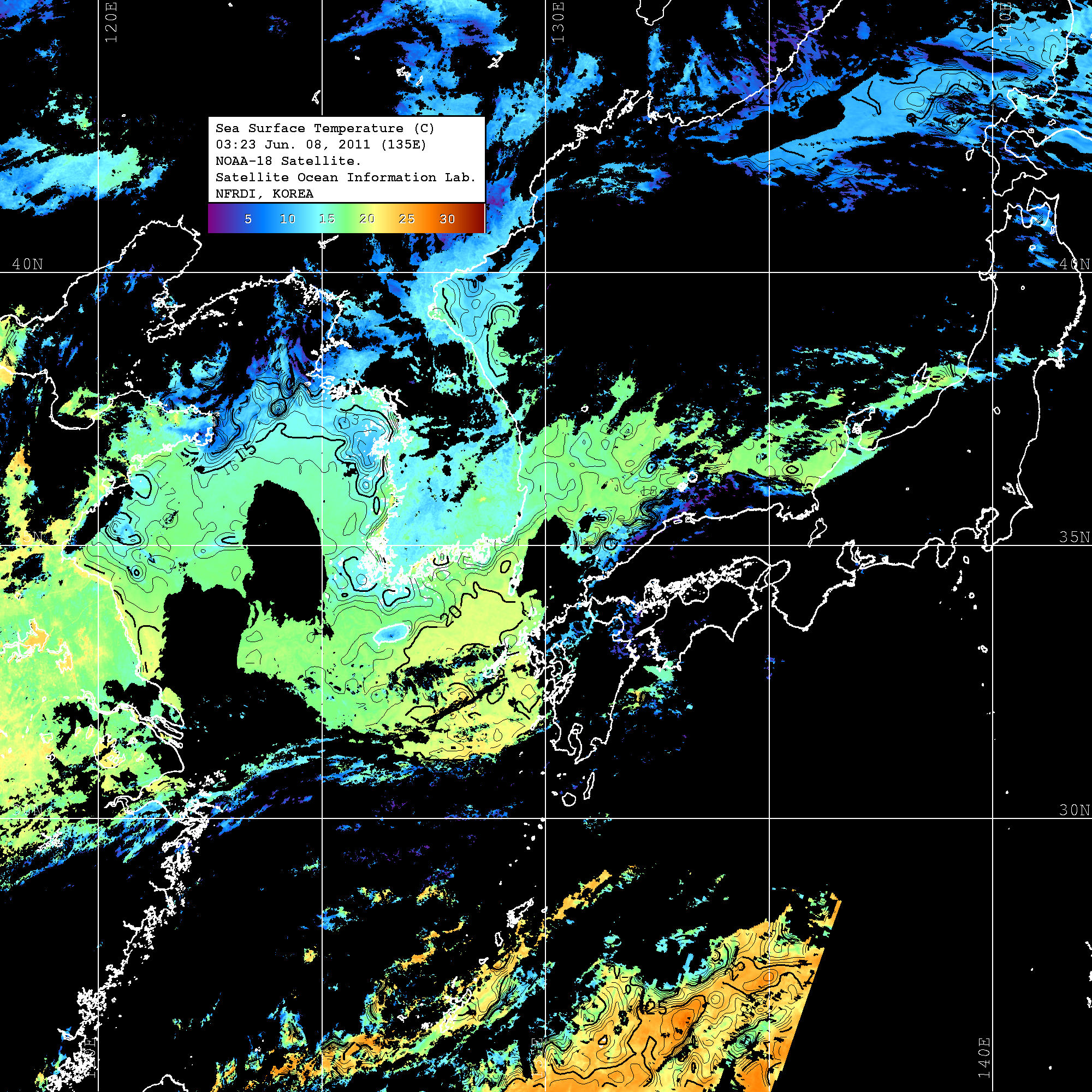 o 2011년 06월 08일 03시 23분 NOAA-18호 위성영상입니다. o 수온분포는 범례를 참고하시기 바랍니다. o 검은색은 구름을 나타냅니다. o 그림을 클릭하시면 크게 보실 수 있습니다.