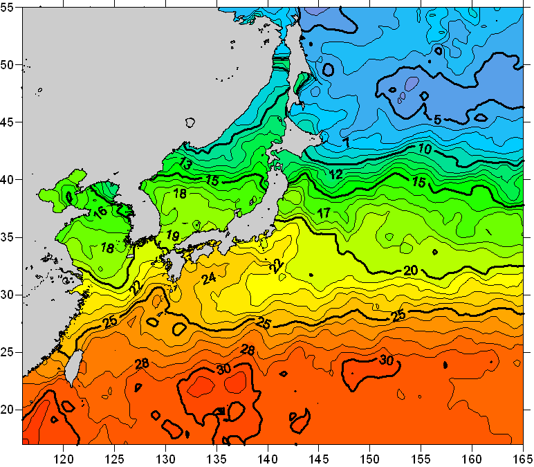 o 2011년 06월 09일 북서태평양 광역해양 수온분포 입니다. o 아래 위성 수온분포도는 국립수산과학원(NFRDI, Korea)과 일본동북대학교 (Tohoku University, Japan)가 공동연구개발 진행중, 1차 연구결과인 것으로 구름의 영향을 배제한 신기술의 수온정보입니다.