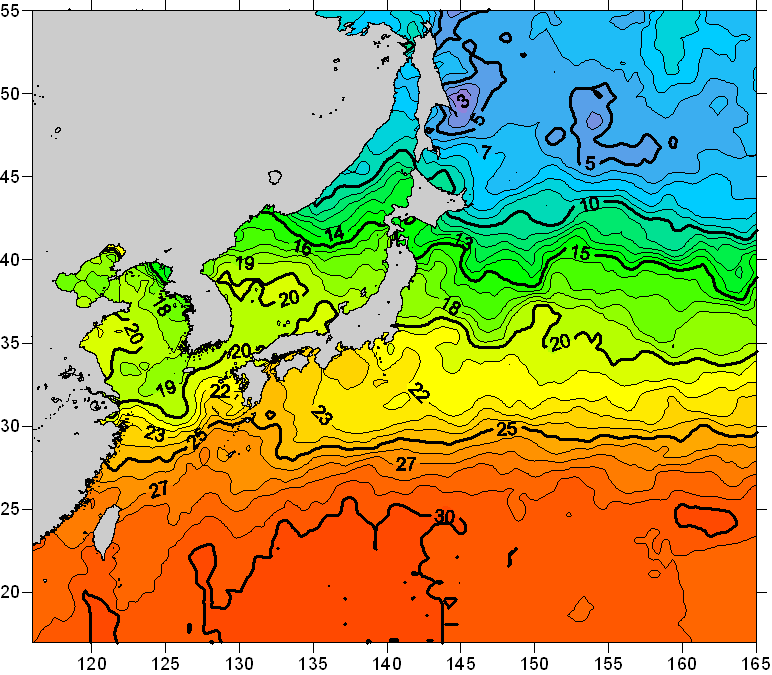 o 2011년 06월 17일 북서태평양 광역해양 수온분포 입니다. o 아래 위성 수온분포도는 국립수산과학원(NFRDI, Korea)과 일본동북대학교 (Tohoku University, Japan)가 공동연구개발 진행중, 1차 연구결과인 것으로 구름의 영향을 배제한 신기술의 수온정보입니다.
