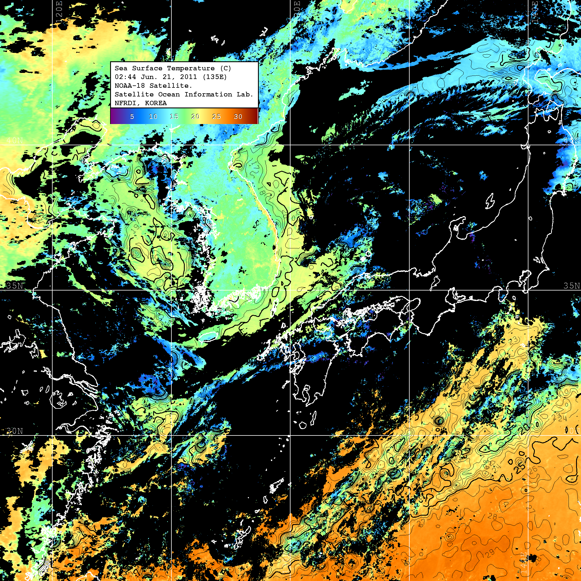 o 2011년 06월 21일 02시 44분 NOAA-18호 위성영상입니다. o 수온분포는 범례를 참고하시기 바랍니다. o 검은색은 구름을 나타냅니다. o 그림을 클릭하시면 크게 보실 수 있습니다.