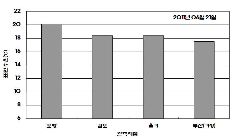 o 2011년 06월 21일 오후 1시를 기해 울기 연안 냉수대 주의보를 해제 합니다. o 2011년 06월 21일 오전 10시 현재 연안 표면수온은 울기 연안에서 18.4℃로 나타나 냉수대 주의보를 해제 합니다. ※ 참고로 울기 연안 냉수대 주의보는 지난 2011년 6월 09일 발령하였습니다. o 냉수대 소멸시 수온 급상승에 따라 양식생물이 피해를 입을 수 있으니 주의하여 주시기 바랍니다. |