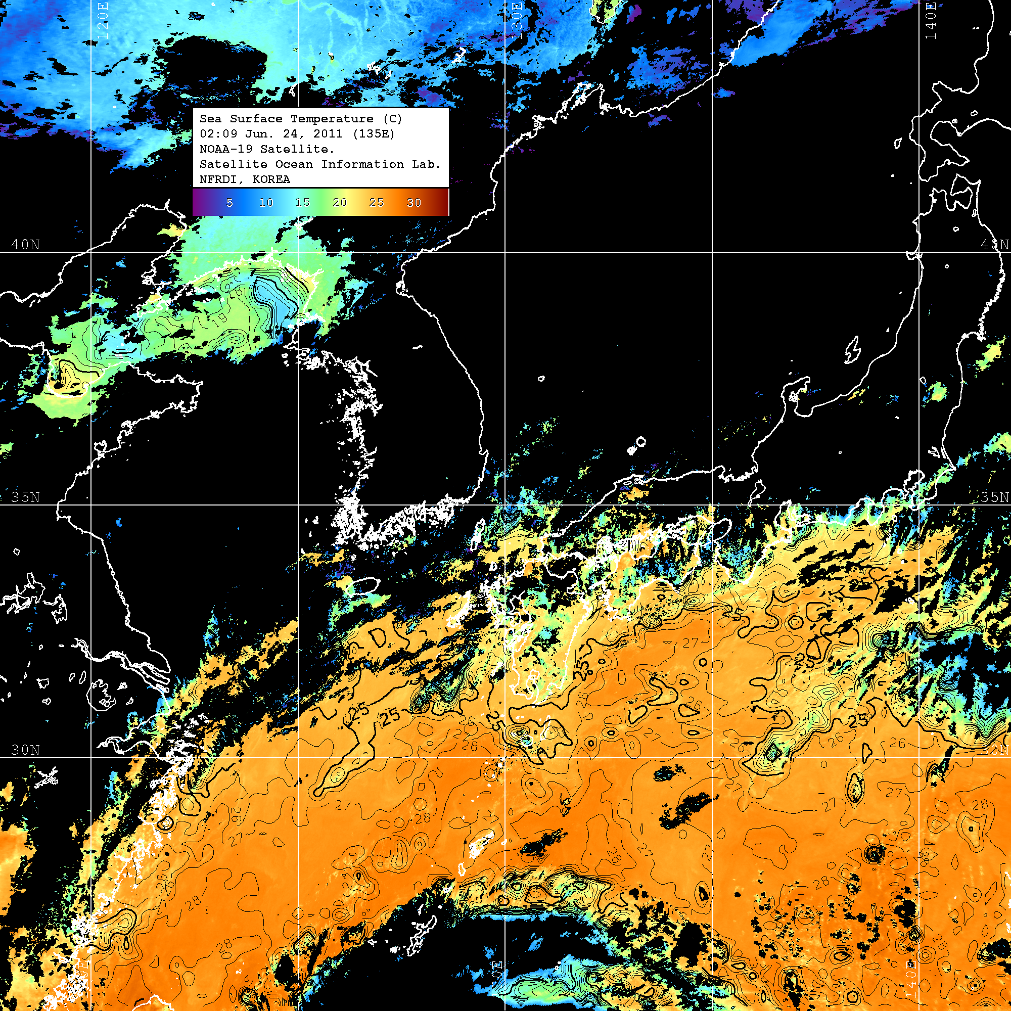 o 2011년 06월 24일 02시 09분 NOAA-19호 위성영상입니다. o 수온분포는 범례를 참고하시기 바랍니다. o 검은색은 구름을 나타냅니다. o 그림을 클릭하시면 크게 보실 수 있습니다.