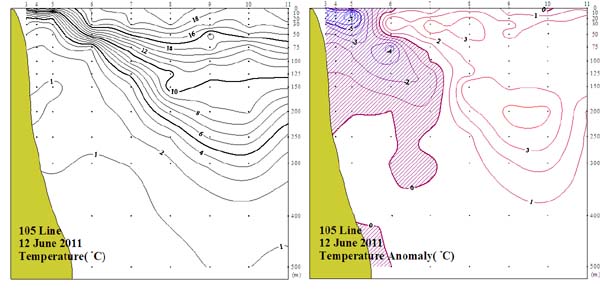 ㅇ 2011년 6월 12일 국립수산과학원 동해수산연구소에서 조사한 105선(동해 동방)의 수직수온분포도 및 평년편차도입니다. ㅇ 수온약층은 연안역에서는 수심 10~75m 부근, 외해역에서는 30~300m사이에서 형성되었습니다. ㅇ 평년에 비하여 0~300m 부근의 내해역에서는 1~7℃의 저온현상을 나타내었고, 그 밖의 외해역과 300m 이심역에서는 1~4℃의 고온현상이 나타났습니다.