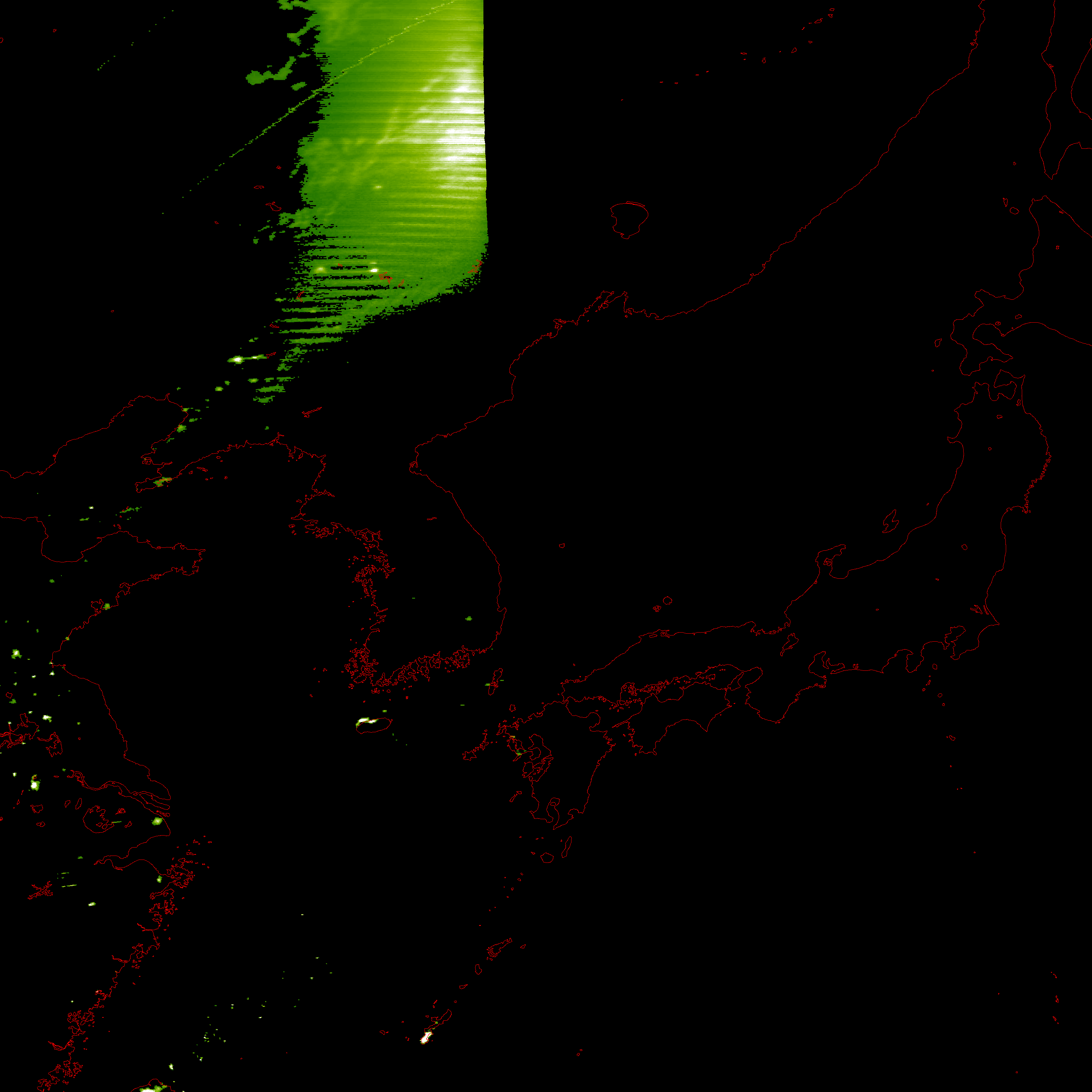 o 2011년 06월 28일 21시 07분 DMSP/OLS(Detense Meteorological Satellite Program/Operating Linescan System) 영상입니다. o DMSP/OLS는 야간 불빛을 탐지하는 위성으로, 야간 조업 어선 분포 현황을 알 수 있습니다. o 그림을 클릭하시면 크게 보실 수 있습니다.