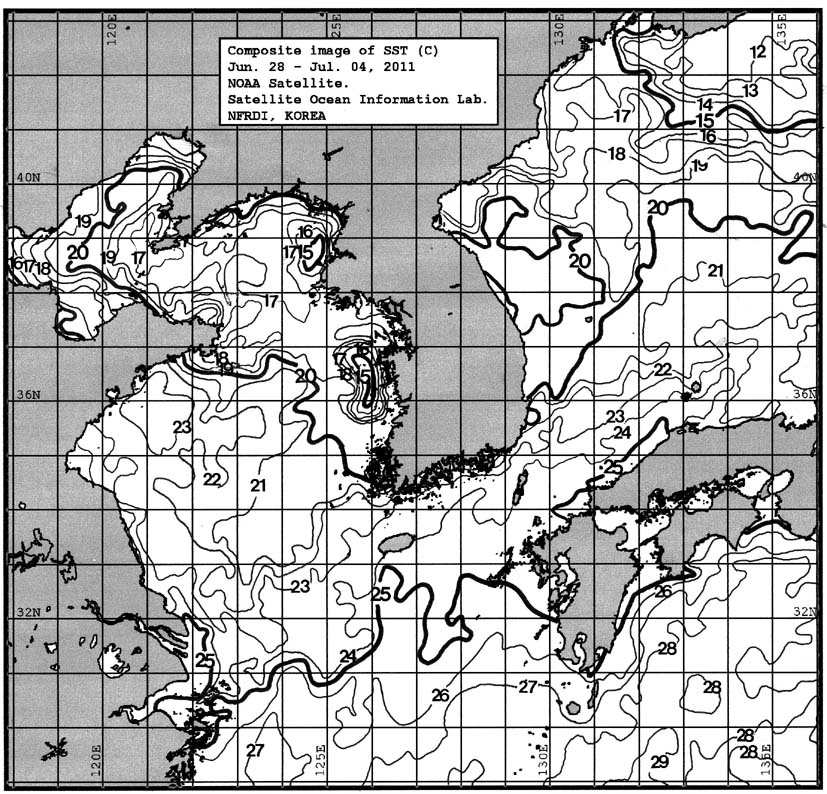 o 금주(2011.06.28~2011.07.04)의 한국근해 표면수온은 대화퇴 근해 19~20도, 울릉도 근해 19~20도, 대마도 근해 23~25도, 제주도 근해 23~25도, 이어도 근해 23~24도, 가거초 근해 21~23도, 어청도 근해 15~16도로 나타납니다. o「평년에 비해」대화퇴 근해 1.1도 낮게, 울릉도 근해 2도 낮게, 대마도 근해 0.9도 높게, 제주도 근해 0.6도 높게, 이어도 근해 1.3도 낮게, 가거초 근해 0.4도 낮게, 어청도 근해는 6.2도 낮게 나타납니다. o「전년에 비해」대화퇴 근해 2.5도 낮게, 울릉도 근해 3도 낮게, 대마도 근해 1.5도 높게, 제주도 근해 0.5도 높게, 이어도 근해 2도 낮게, 가거초 근해 2.5도 낮게, 어청도 근해는 7.5도 낮게 나타납니다. o 수온 전선대는 우리나라 제주해협에서 대한해협까지 23도를 중심으로 형성됩니다.