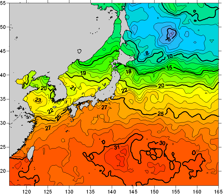 o 2011년 07월 05일 북서태평양 광역해양 수온분포 입니다. o 아래 위성 수온분포도는 국립수산과학원(NFRDI, Korea)과 일본동북대학교 (Tohoku University, Japan)가 공동연구개발 진행중, 1차 연구결과인 것으로 구름의 영향을 배제한 신기술의 수온정보입니다.