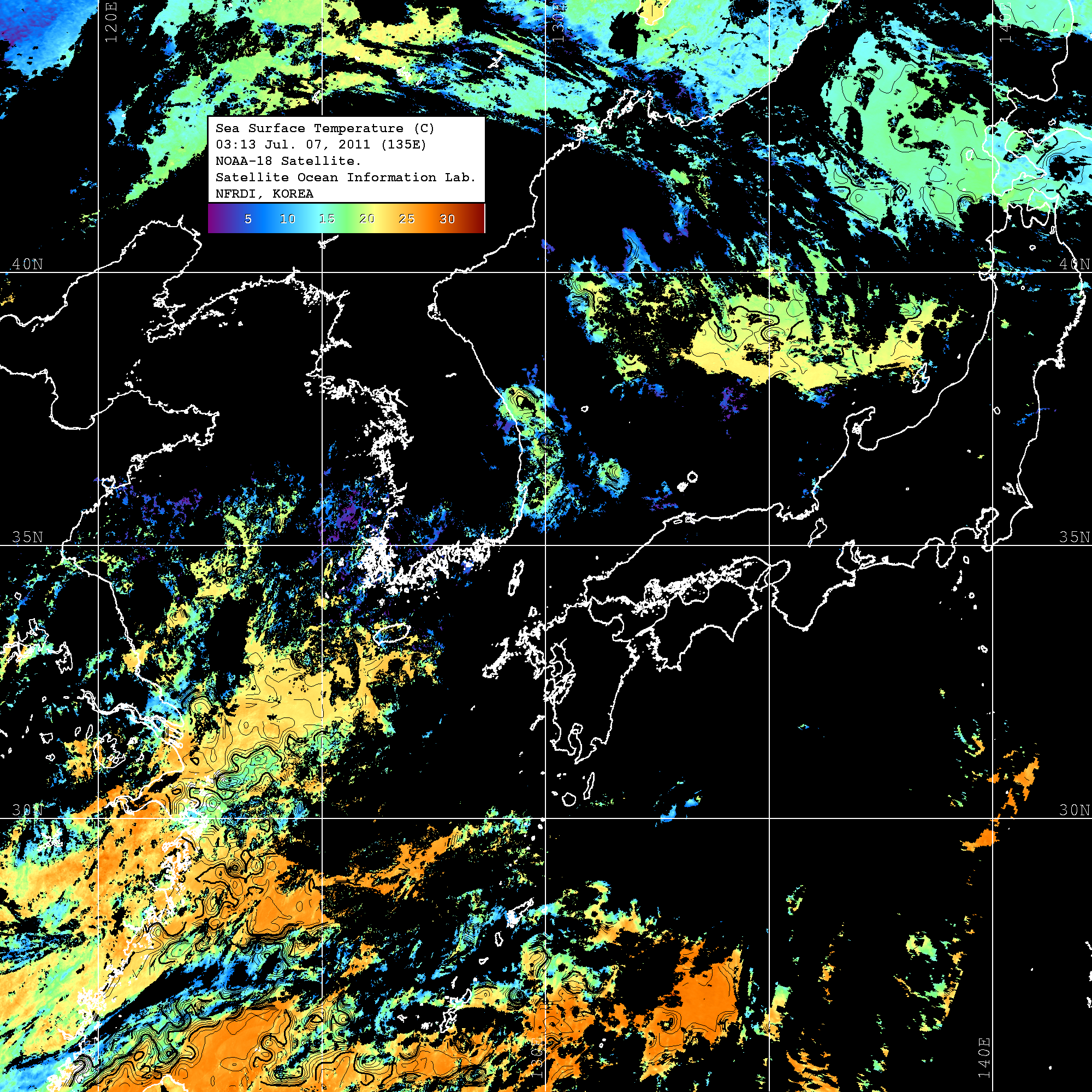 o 2011년 07월 07일 03시 13분 NOAA-18호 위성영상입니다. o 수온분포는 범례를 참고하시기 바랍니다. o 검은색은 구름을 나타냅니다. o 그림을 클릭하시면 크게 보실 수 있습니다.