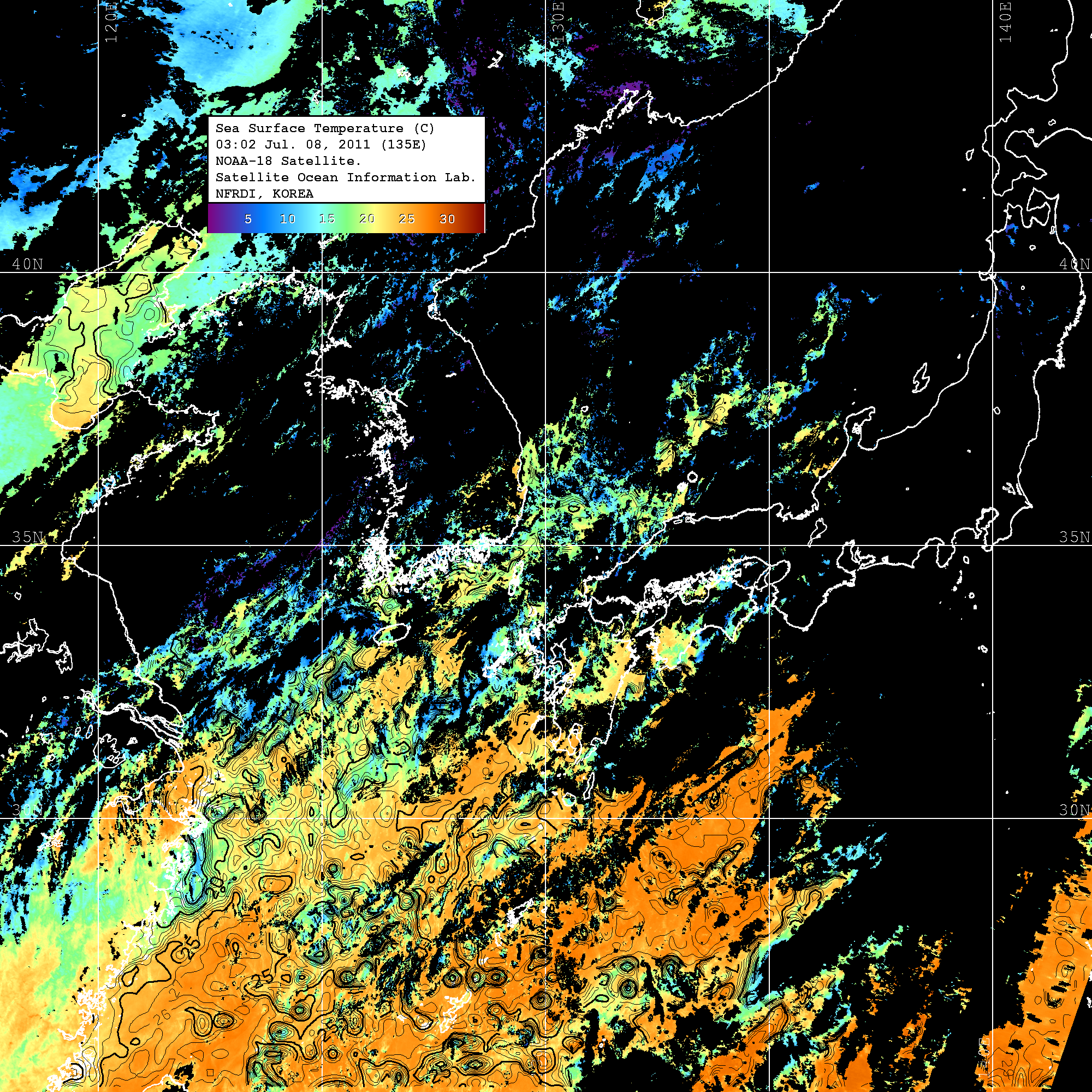 o 2011년 07월 08일 03시 02분 NOAA-18호 위성영상입니다. o 수온분포는 범례를 참고하시기 바랍니다. o 검은색은 구름을 나타냅니다. o 그림을 클릭하시면 크게 보실 수 있습니다.