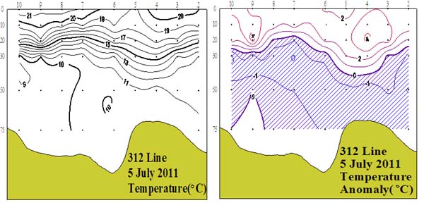 ㅇ 2011년 7월 5일 국립수산과학원 서해수산연구소에서 조사한 312선 (제주해협 서방)의 수직수온분포도 및 평년편차도입니다. ㅇ 수온약층은 10~30m 부근에서 14℃를 중심으로 형성되었습니다. ㅇ 평년에 비하여 표층~30m 수층에서는 0~3℃의 고온현상을 보였으며, 30m 이심에서는 1℃ 내외의 저온현상을 나타내었습니다.