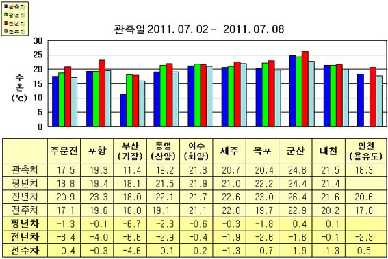 o 금주(2011.07.02~2011.07.08)의 한반도 연안 표면수온은 동해 연안역에서 섭씨 11~19.5도, 남해 연안역 19~21.5도, 서해 연안역에서 18~25도로 나타납니다. o 평년에 비해 포항 비슷함을 제외한 동해 연안역은 1~7도 낮게, 제주 비슷함을 제외한 남해 연안역은 0.5~2.5도 낮게, 군산 0.4도 높음을 제외한 서해 연안역은 0.5~2.0도 낮게 나타납니다. o 전년에 비해 동해 연안역은 3~7도 낮게, 남해 연안역은 0.5~3.0도 낮게, 대천 비슷함을 제외한 서해 연안역은 1.5~3.0도 낮게 나타납니다. o 현재 울기, 부산(기장) 연안에는 냉수대 경보가 울진, 감포 및 거제 연안에는 냉수대 주의보가 발령되어 있으니 해당해역에서는 각별한 주의를 기울여 주시기 바랍니다.