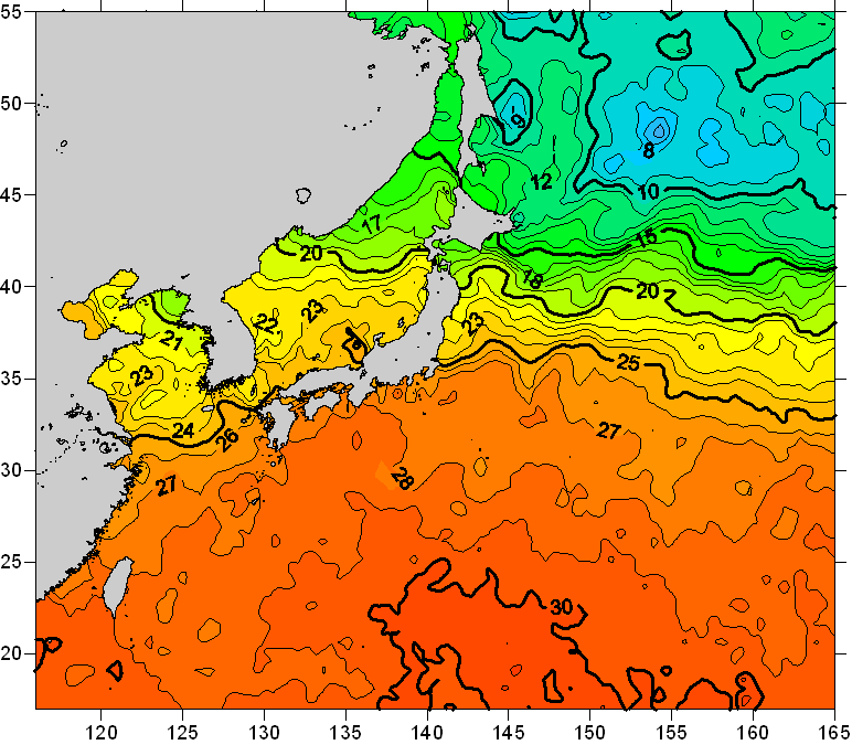 o 2011년 07월 12일 북서태평양 광역해양 수온분포 입니다. o 아래 위성 수온분포도는 국립수산과학원(NFRDI, Korea)과 일본동북대학교 (Tohoku University, Japan)가 공동연구개발 진행중, 1차 연구결과인 것으로 구름의 영향을 배제한 신기술의 수온정보입니다. |