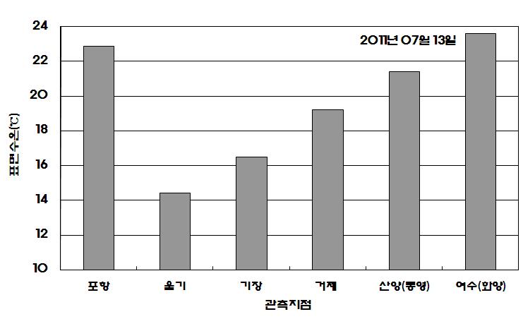 o 2011년 07월 13일 오후 2시를 기해 거제 연안 냉수대 주의보 해제, 울기 및 부산(기장) 연안 냉수대 주의보를 발령합니다. o 아래 그림은 2011년 07월 13일 오전 10시에 관측된 현장 표면수온 분포입니다. o 연안 관측 표면수온은 포항 22.9도, 울기 14.4도, 부산(기장) 16.5도, 거제 19.2도, 산양(통영) 21.4도, 여수(화양) 23.6도로 나타납니다. o 2011년 06월 24일 발령한 울기 연안 냉수대 경보(해양자료속보, 제3972호) 및 2011년 07월 05일 발령한 부산(기장) 연안 냉수대 경보(해양자료속보, 제3982호)는 2011년 07월 13일 2시를 기해 냉수대 주의보로 전환 됩니다. o 현재 울진 연안 냉수대 주의보(해양자료속보, 제3971호) 및 감포 연안 냉수대 주의보(해양자료속보, 제3982호)는 연안 관측 표면수온이 울진 14.7도, 감포 15.1도로 나타나 유효합니다. o 냉수대가 발생한 해역은 수온변동과 짙은 안개가 나타나고 있어 각별한 주의가 필요합니다.