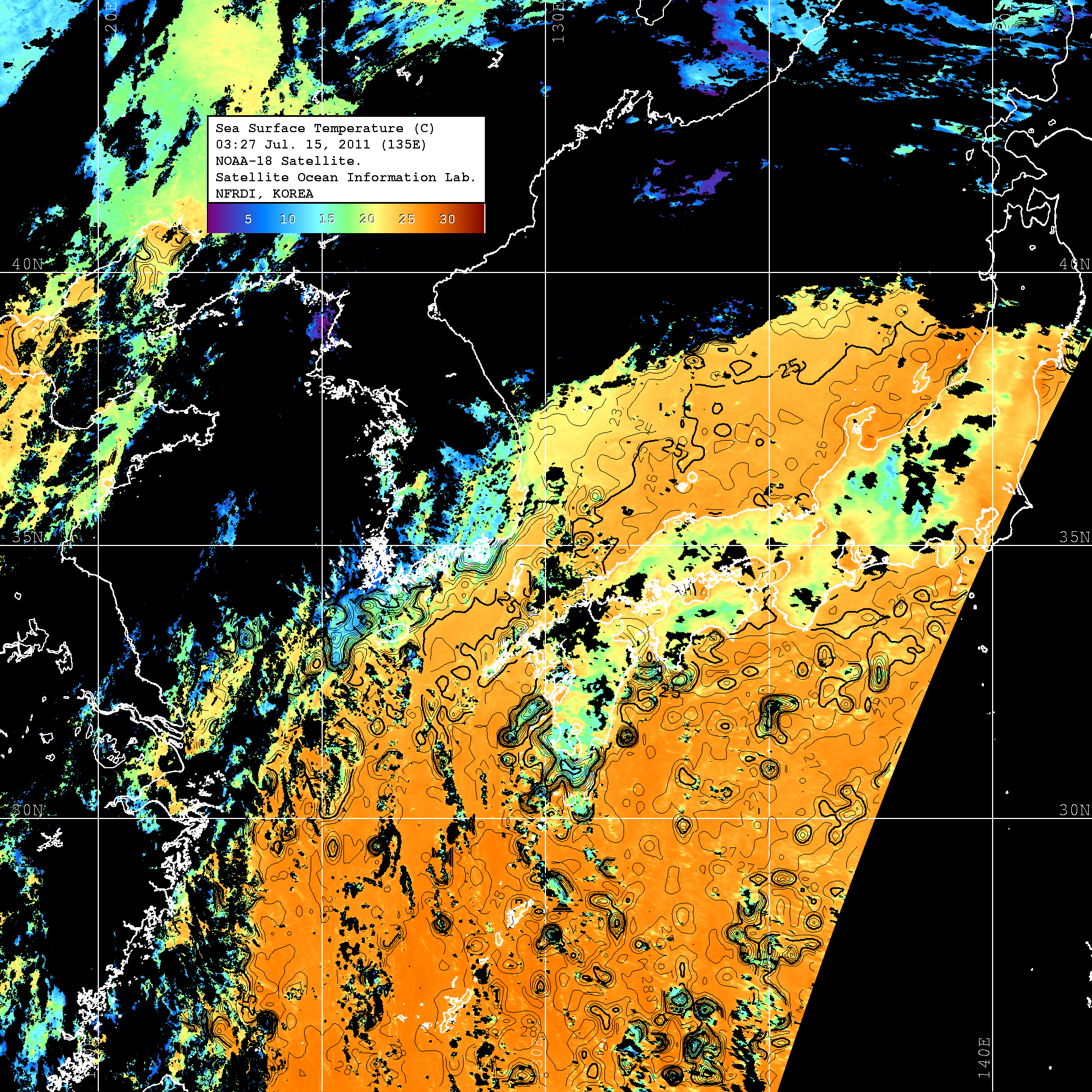 o 2011년 07월 15일 03시 27분 NOAA-18호 위성영상입니다. o 수온분포는 범례를 참고하시기 바랍니다. o 검은색은 구름을 나타냅니다. o 그림을 클릭하시면 크게 보실 수 있습니다.
