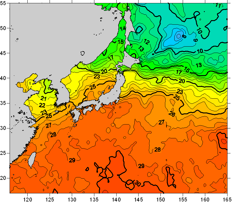 o 2011년 07월 14일 북서태평양 광역해양 수온분포 입니다. o 아래 위성 수온분포도는 국립수산과학원(NFRDI, Korea)과 일본동북대학교 (Tohoku University, Japan)가 공동연구개발 진행중, 1차 연구결과인 것으로 구름의 영향을 배제한 신기술의 수온정보입니다.