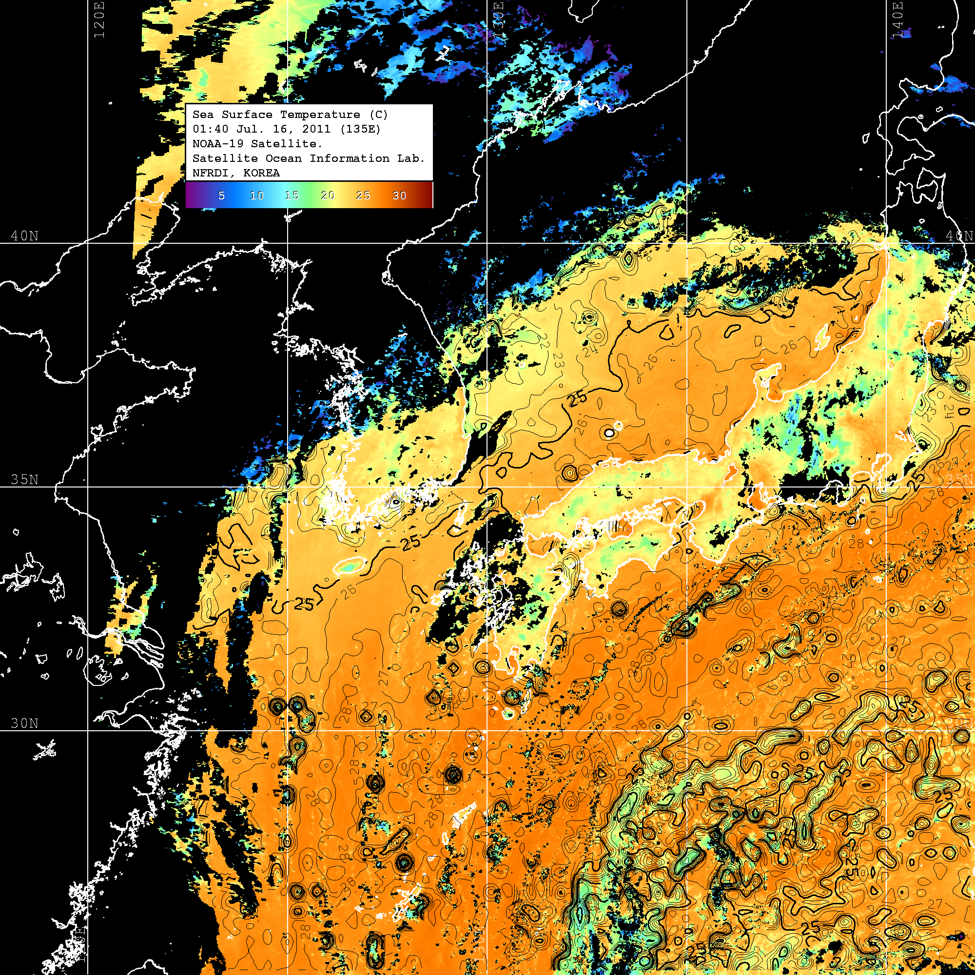 o 2011년 07월 16일 01시 40분 NOAA-19호 위성영상입니다. o 수온분포는 범례를 참고하시기 바랍니다. o 검은색은 구름을 나타냅니다. o 그림을 클릭하시면 크게 보실 수 있습니다.