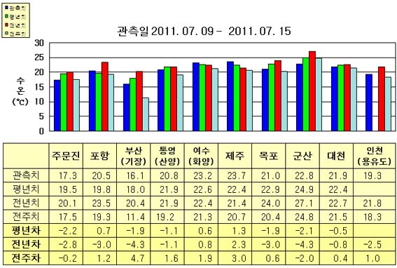 o 금주(2011.07.09~2011.07.15)의 한반도 연안 표면수온은 동해 연안역에서 섭씨 16.0~20.5도, 남해 연안역 20.5~24.0도, 서해 연안역에서 19~23도로 나타납니다. o 평년에 비해 포항 0.7도 높음을 제외한 동해 연안역은 1.5~2.5도 낮게, 통영(산양) 1.1도 낮음을 제외한 남해 연안역은 0.5~1.5도 높게, 서해 연안역은 0.5~2.0도 낮게 나타납니다. o 전년에 비해 동해 연안역은 2.5~4.5도 낮게, 통영(산양) 1.1도 낮음을 제외한 남해 연안역은 0.5~2.5도 높게, 서해 연안역은 0.5~4.5도 낮게 나타납니다. o 현재 울진, 감포 및 울기 연안에는 냉수대 주의보가 발령되어 있으니 해당해역에서는 각별한 주의를 기울여 주시기 바랍니다.