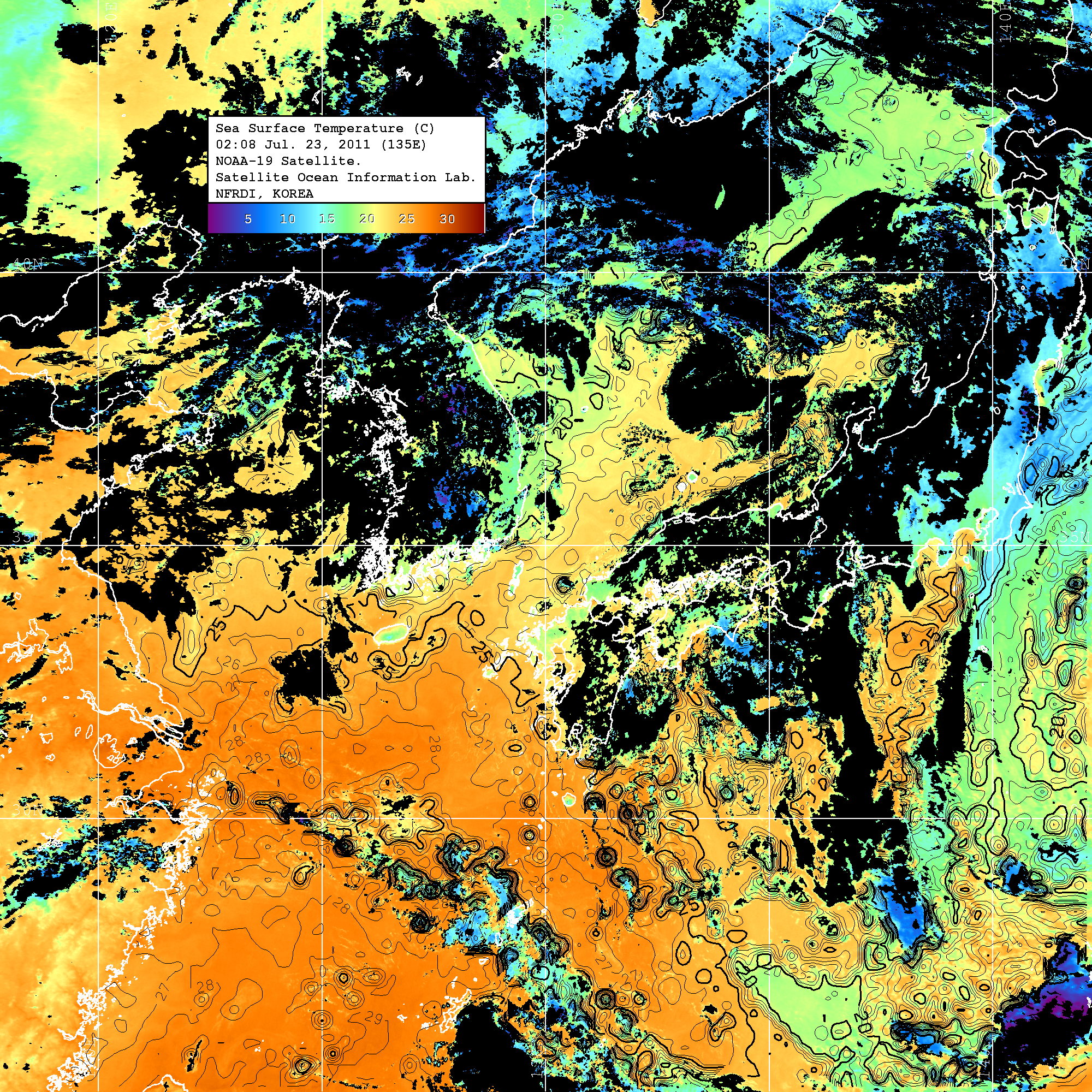 o 2011년 07월 23일 03시 08분 NOAA-19호 위성영상입니다. o 수온분포는 범례를 참고하시기 바랍니다. o 검은색은 구름을 나타냅니다. o 그림을 클릭하시면 크게 보실 수 있습니다.