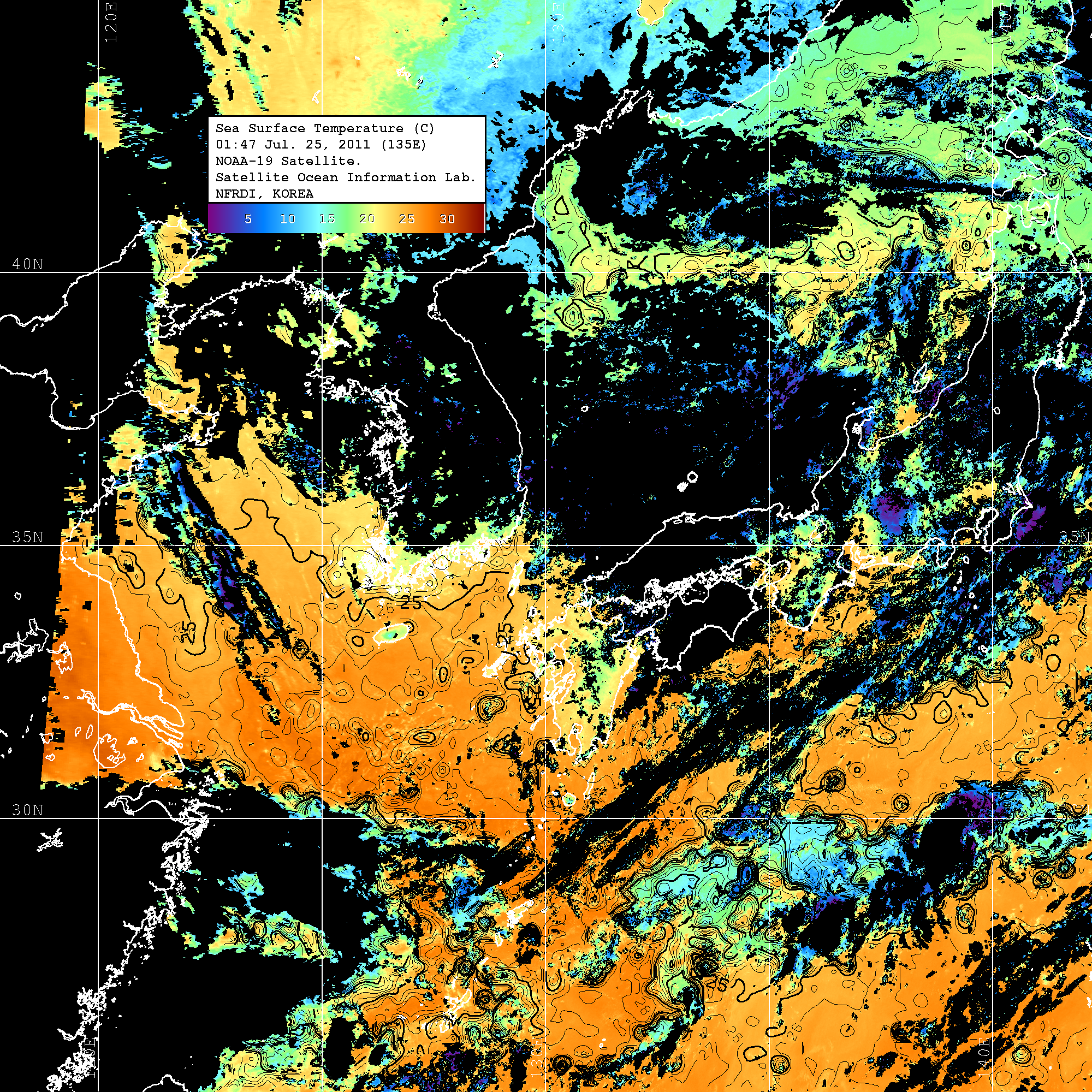 o 2011년 07월 25일 02시 47분 NOAA-19호 위성영상입니다. o 수온분포는 범례를 참고하시기 바랍니다. o 검은색은 구름을 나타냅니다. o 그림을 클릭하시면 크게 보실 수 있습니다.
